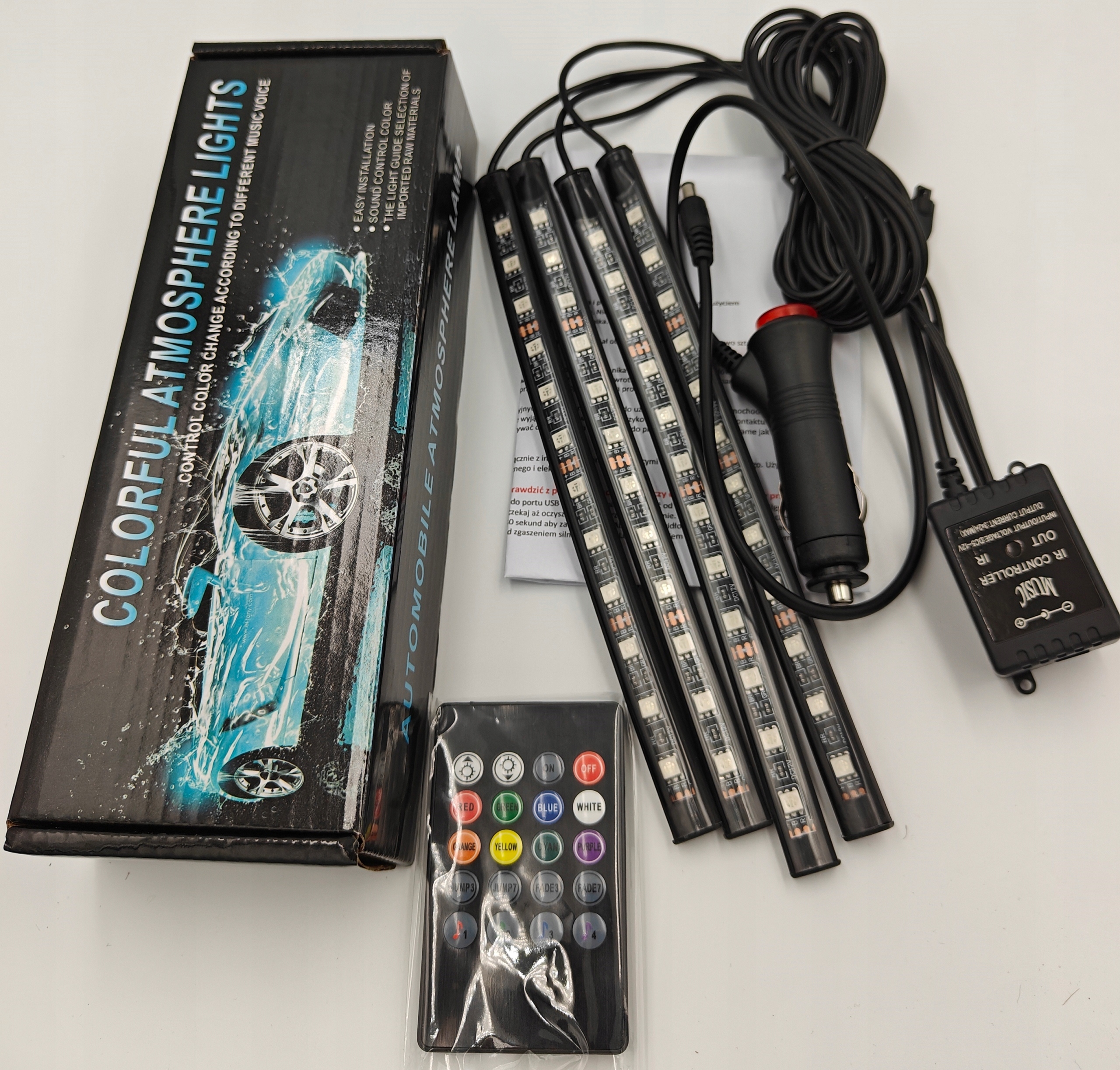 | ОРИГИНАЛЬНЫЕ СВЕТОДИОДНЫЕ ЛЕНТЫ MIK-STAR | Длина кабеля: длинные кабели 2 х 170 см для задней части автомобиля и короткие 2 х 120 см для передней части автомобиля | МАКС. МОЩНОСТЬ 8 Вт | МНОГОФУНКЦИОНАЛЬНЫЙ ПУЛЬТ ДУ 20 КНОПОК | ПОЛНАЯ НАСТРОЙКА | БЛОК ПИТАНИЯ, ПОДКЛЮЧЕННЫЙ К АВТОМОБИЛЬНОМУ ПРИГОРЯДУ | МНОГОЦВЕТНЫЙ RGBW | ОЦЕНКА (А+) | IP 65 ВОДОНЕПРОНИЦАЕМОСТЬ | ДИОДЫ SMD 5050 | ЯРКИЕ ЦВЕТА | СРОК СЛУЖБЫ СВЕТОДИОДОВ 50 000 ЧАСОВ |