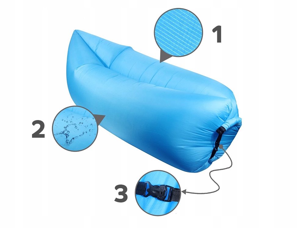 Lazy BAG - это очень простая конструкция, состоящая из двух камер, наполненных воздухом, и пряжки, удерживающей ее внутри. Наша модель имеет два слоя, внешний — прочный полиэстер, защищающий от потертостей, и внутренний — фольга, не пропускающая воздух. Таким образом, этот надувной диван хорошо работает на траве, песке и воде и может использоваться в качестве матраса. Мы предлагаем размер XXL, то есть 180х70 см.