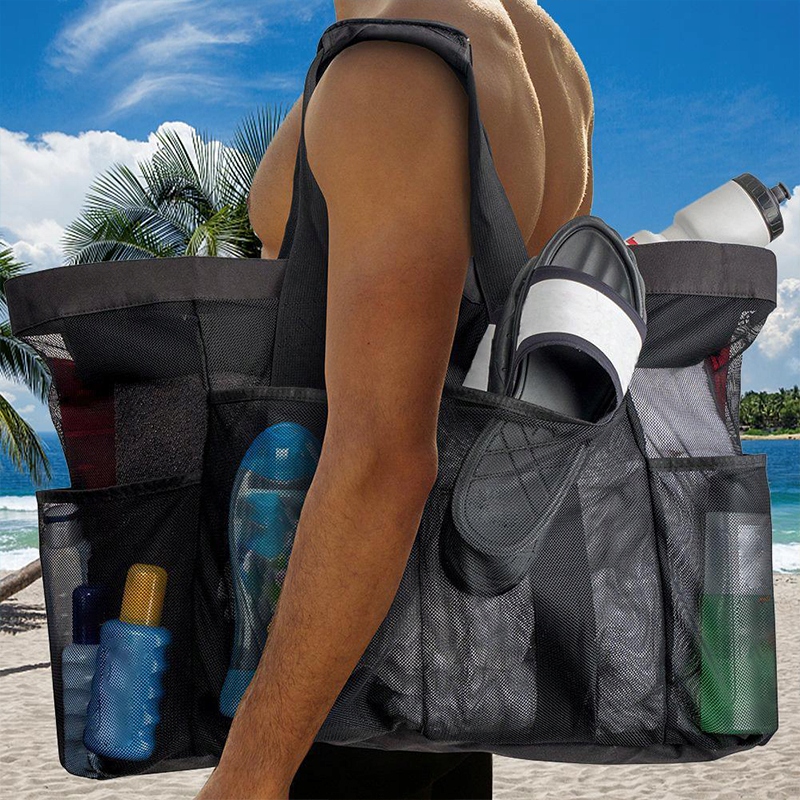 Главным преимуществом нашей сумки является ее сетчатая конструкция, которая позволяет содержимому быстро высохнуть. Вам больше не придется беспокоиться о том, что влажные вещи испачкаются или будут плохо пахнуть. Сетчатая структура также обеспечивает вентиляцию, что помогает предотвратить появление неприятных запахов. Выгружайте песок с легкостью и находите нужные предметы быстрее, чем раньше, благодаря прозрачности b> сумки < Через несколько минут вы найдете нужный предмет и тщательно протрите свою сумку.
