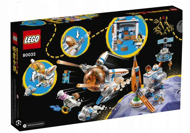 Набор LEGO® Monkie Kid™ «Фабрика лунных пирогов Чанъэ» (80032) познакомит детей с китайской легендой. В набор входит сборная лунная база Чанъэ, платформа для прямых трансляций, линия по сборке печенья, ракета в форме морковки для транспортировки выпечки и механического кролика, который стреляет кубиками. В набор также входят три минифигурки кота Мо и две фигурки кроликов. Набор дополнен оружием и аксессуарами, такими как кольцо с синим пламенем для творческих игр.
