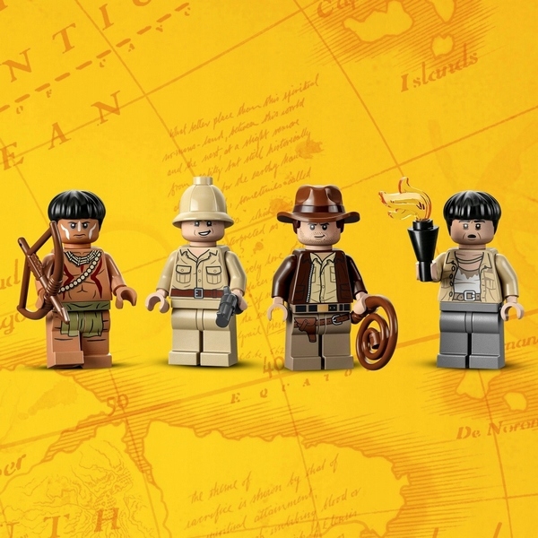Эта памятная модель LEGO Индианы Джонса включает в себя 4 минифигурки: Индиану Джонса, Сатипо, Беллока и воина Ховитоса.