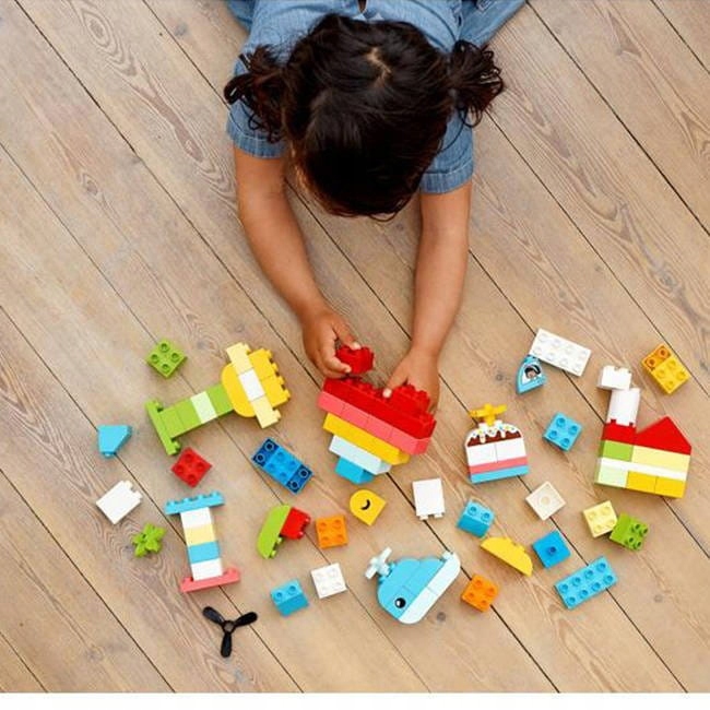 Большие и красочные кубики Лего в коробке с сердечком для детей от 18 месяцев. В наборе 80 блоков, предназначенных для детских ручек, из которых дети смогут собрать до 15 простых моделей, таких как: домик, мороженое, кит, утка или цветок.