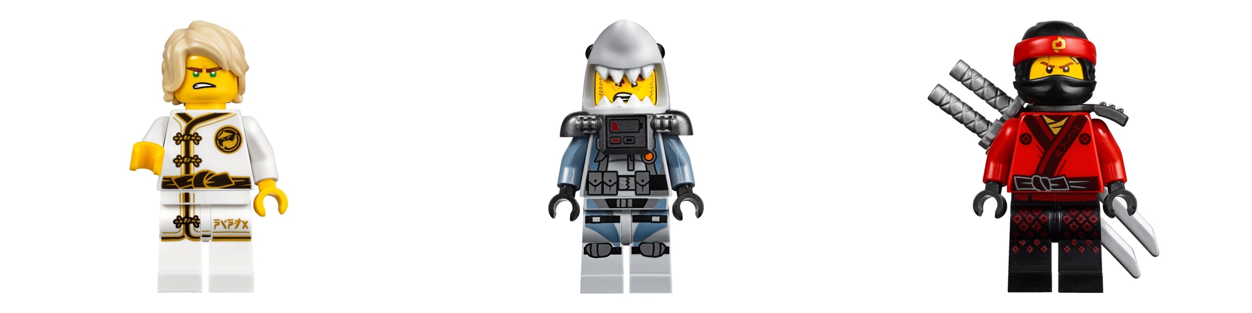 • В комплект входят 3 минифигурки: Кай, Ллойд и Акула.