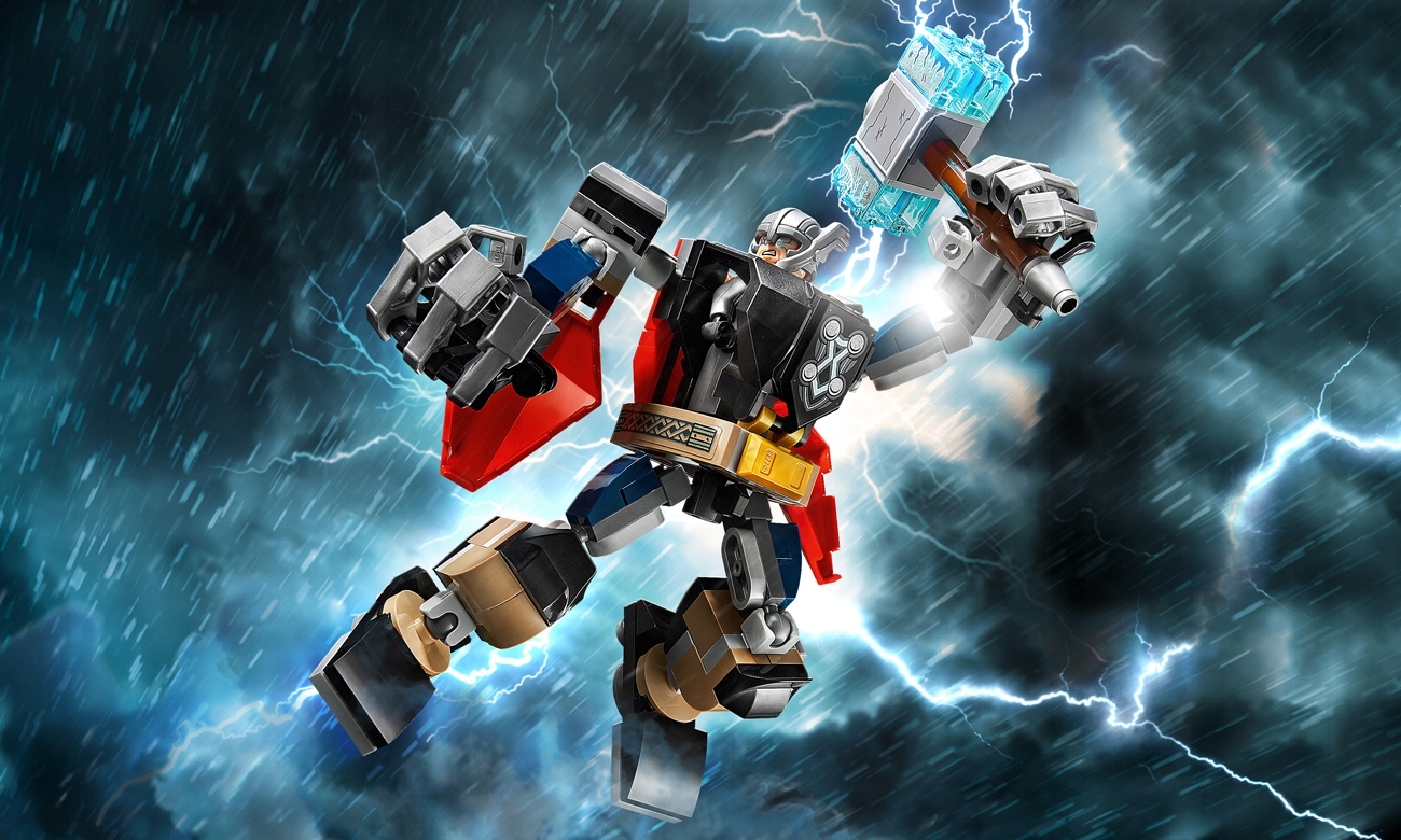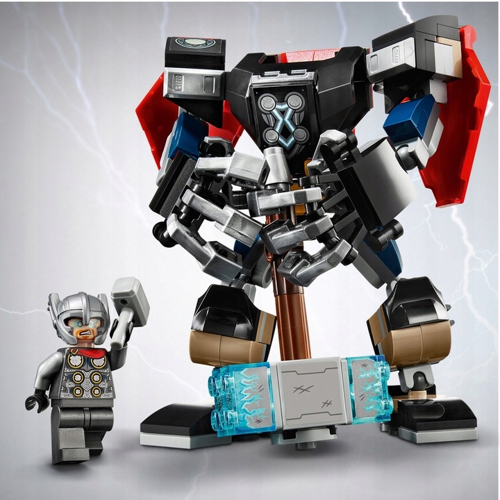 - Включает в себя сборного робота с гигантским молотом, а также минифигурка Тора с молотком меньшего размера, который можно прикрепить к ноге робота.