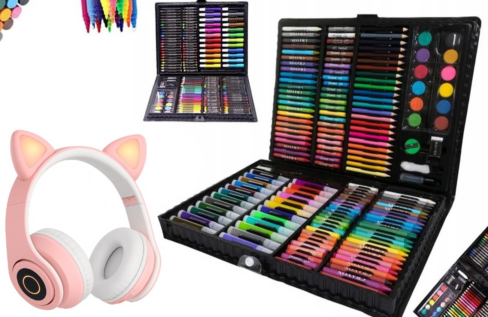 Стит маркеров, маркеры, карандаши 168 эль + розовые наушники кошачьи уши