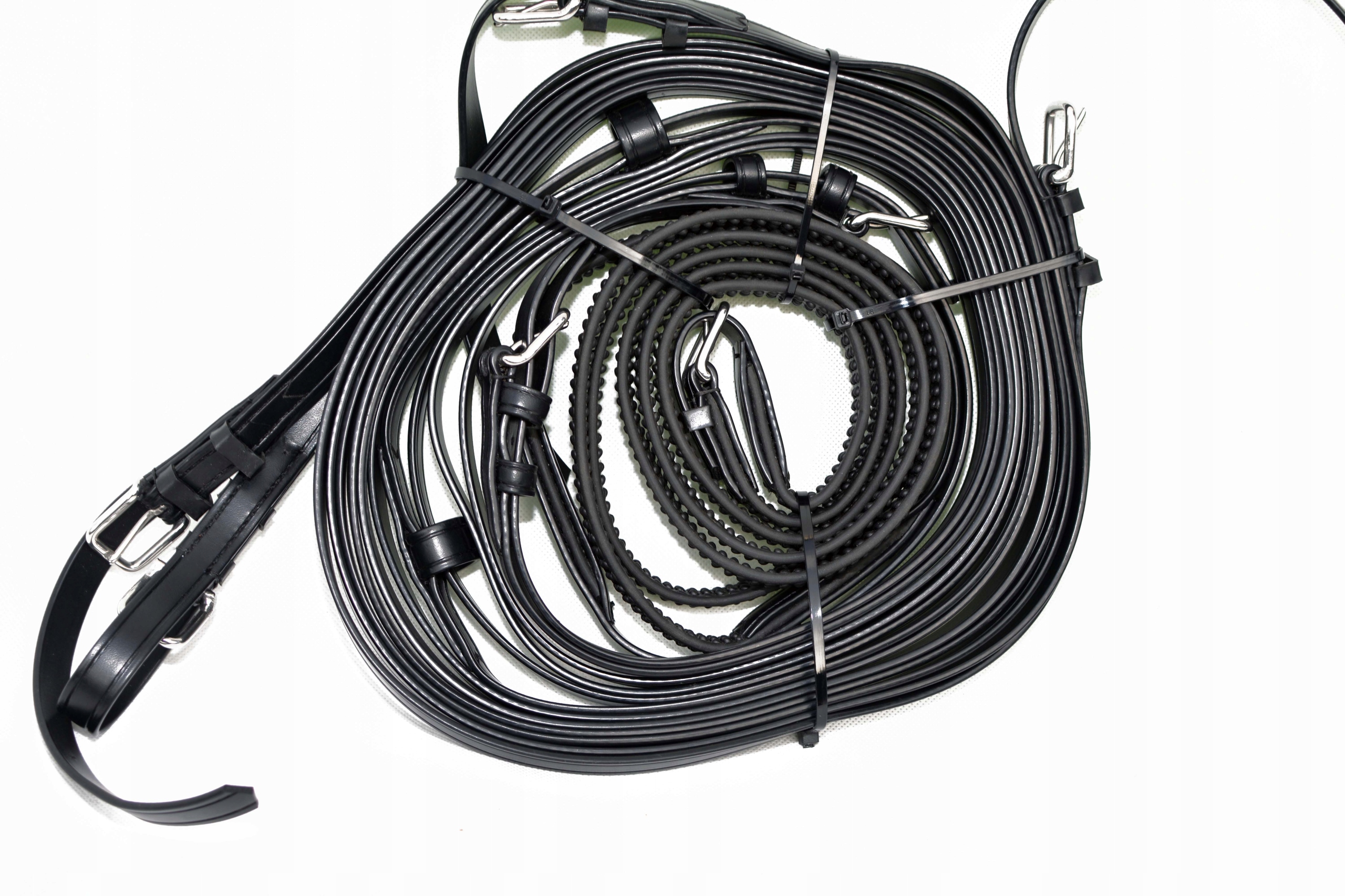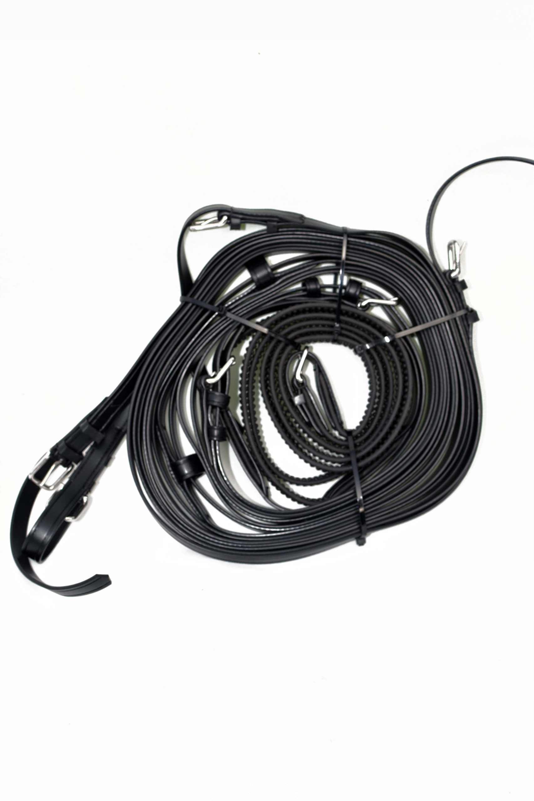 Поводья для пары лошадей общей длиной 10 м, полностью изготовлены из очень прочного и долговечного материала, устойчивого к разрыву, антибактериальному и устойчивому к УФ-излучению, главное преимущество поводьев в том, что они не требует никакого ухода, просто вода. Фурнитура из нержавеющей стали с пряжкой или застежкой на подставках.