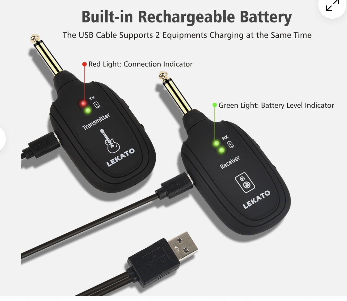Встроенная литий-ионная батарея обеспечивает время передатчика и гитарного приемника в течение 4 часов. USB -кабель обеспечивает удобную зарядку, что гарантирует хорошую производительность во время каждой производительности.
