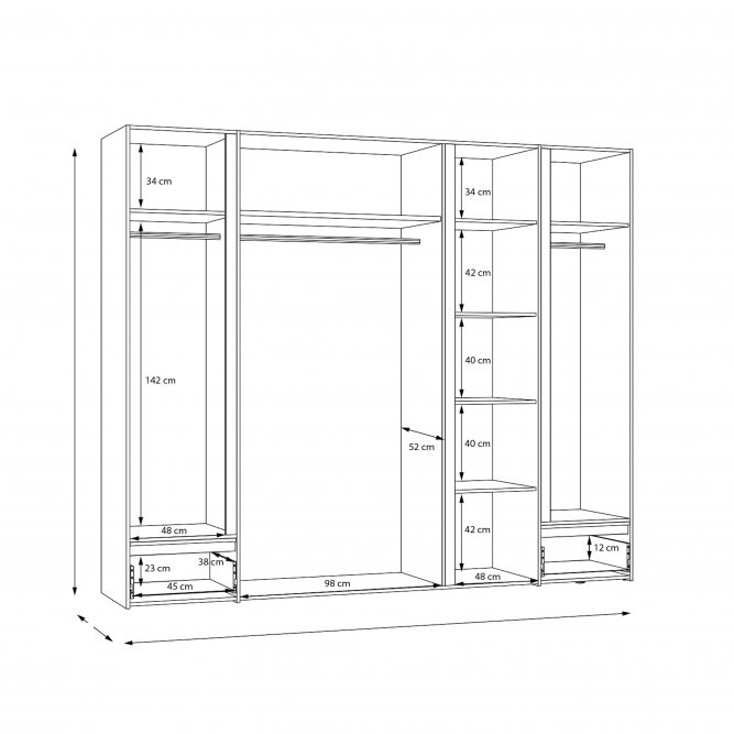 - Функциональный предмет мебели с размерами: ширина 251,2 см х высота 210 см х глубина 54,2 см.