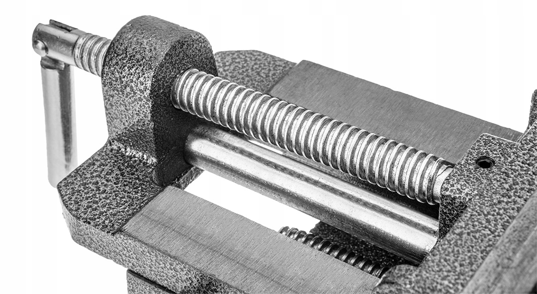 Тиски можно регулировать по двум осям – вертикальной и горизонтальной. Он устойчив к высокому давлению, а благодаря Т-образному винтовому стержню отличается еще большей прочностью. Ширина челюстей составляет 100 мм, а их раскрытие — 90 мм. Высота тисков 145 мм.