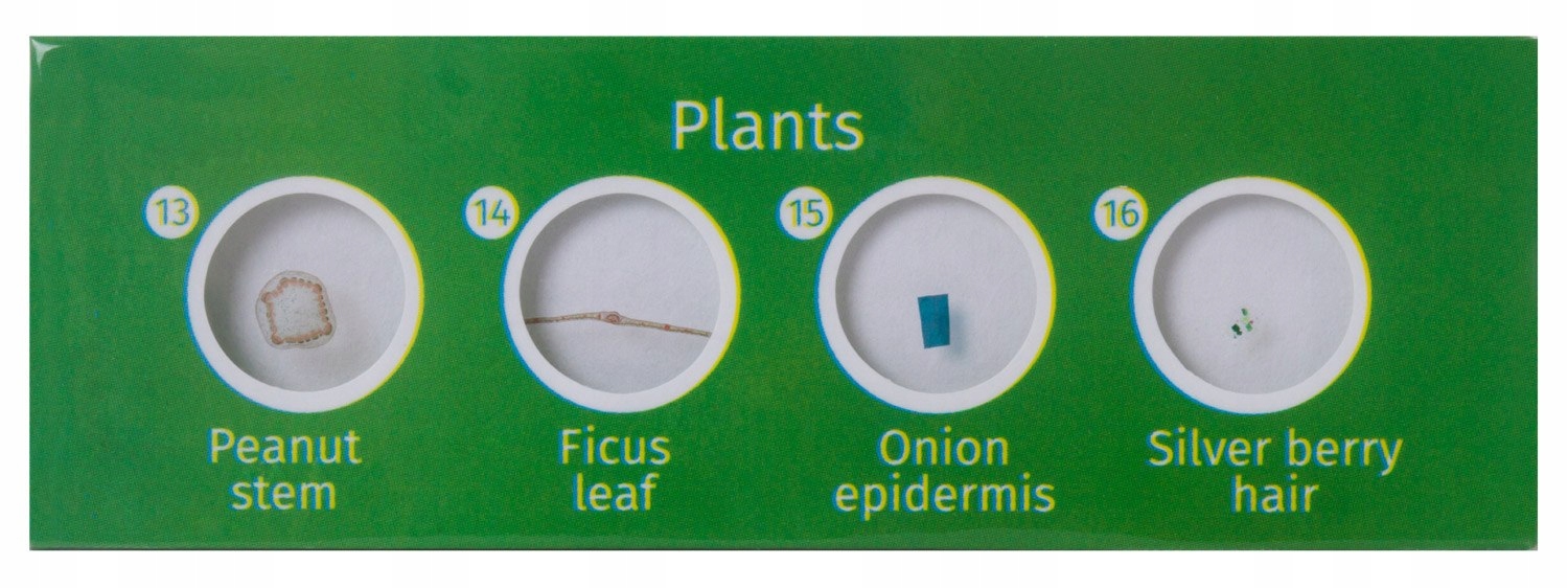 Все предметные стекла разделены на группы по категориям и размещены на предметных стеклах, которые можно легко перемещать по предметному столику микроскопа. . Предметные стекла покрыты цветной бумагой с круглыми прозрачными отверстиями. Каждый препарат маркируется. Препараты хранятся в прочной картонной упаковке.