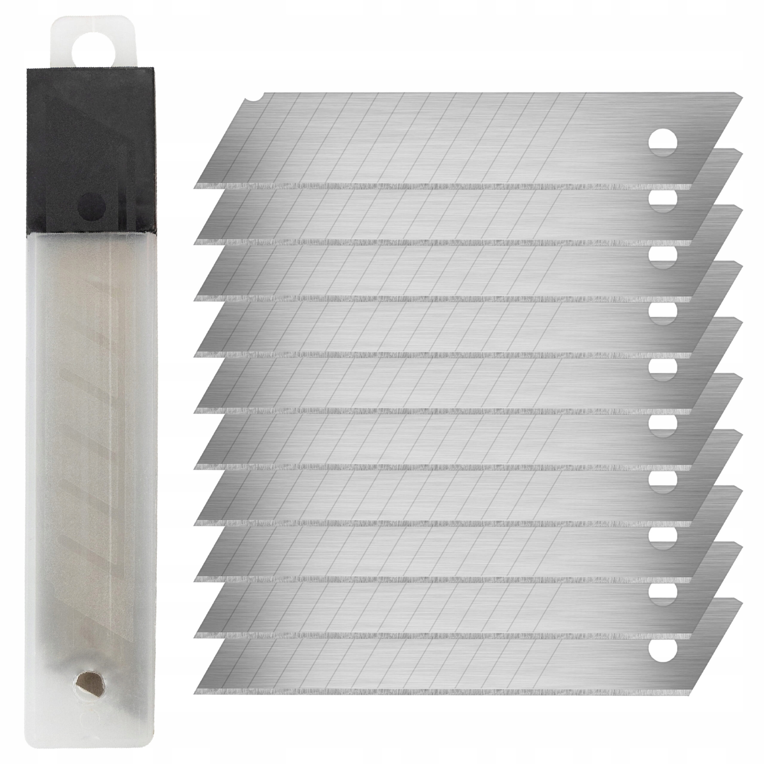 В набор входит 40 лезвий, что обеспечивает длительный срок использования и исключает необходимость необходимость частой замены ножей. Эти лезвия специально разработаны для работы с тормозными ножами стандартной шириной 18 мм. Их универсальный размер делает их пригодными для различных применений: от резки бумаги и картона до более сложных работ с пластиком, обоями или фанерой.