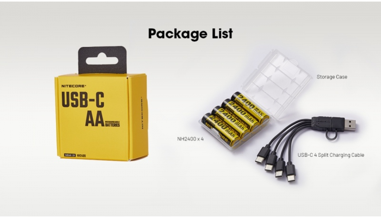 AA NITECORE NH2400 Маленькая батарея объединяет универсальный размер и передовые технологии. Вместимость 2400 мАч и постоянное напряжение 1,5 В делают их идеальными для камер, часов, пилотов, фонариков, вентиляторов, клавиатур и других гаджетов. The built-in USB-C port allows you to charge batteries directly or using a charger. Удобный разделенный адаптер из 4 кабелей USB-C позволяет одновременно заряжать все 4 батареи. Полная зарядка занимает около 3 часов.