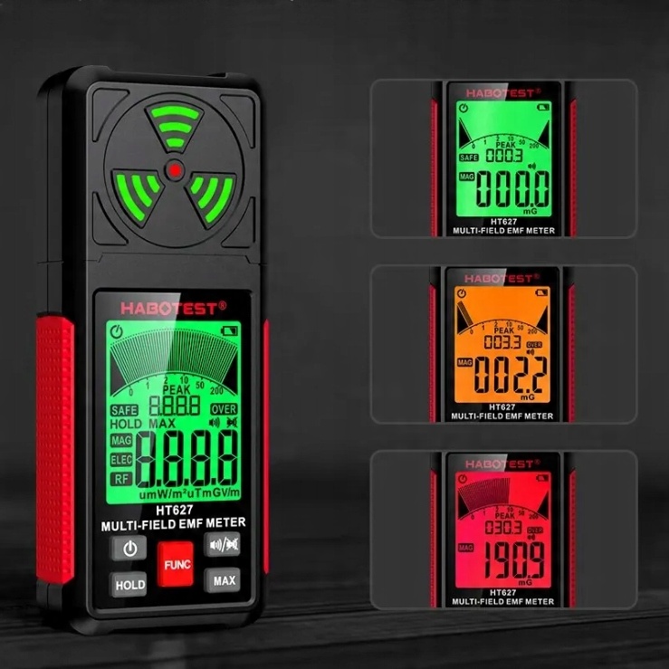 После включения выберите нужную функцию обнаружения. Когда устройство обнаруживает магнитное поле (или электрическое поле, радиочастоту), оно отображает разные цвета подсветки в зависимости от величины измененного значения, чтобы предупредить пользователя.