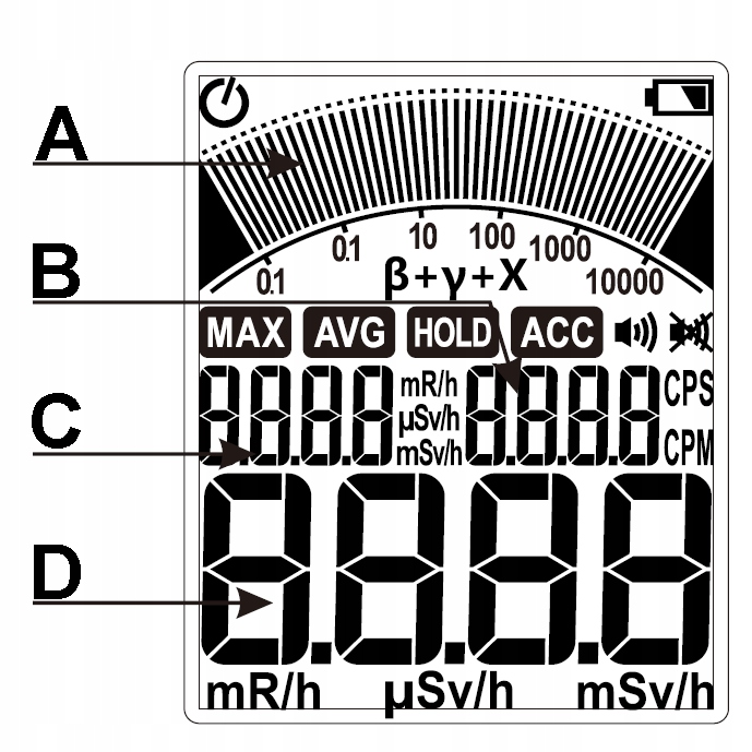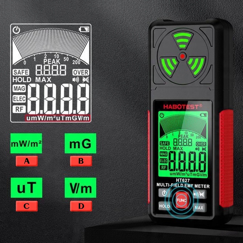 Нажмите кнопку "FUNC" для переключения между режимами измерения магнитного поля (uT), измерение магнитного поля (мГ), измерение электрического поля (В/м) и измерение высокой частоты (мВт/м2).