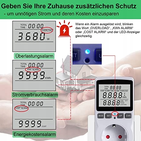 - Если эффективность, затраты на энергию или энергопотребление превышают заданную стоимость, «перегрузка», «тревога затрат» или «КВт -сигнал» на экране, и индикатор светодиода предупреждает пользователей о предоставлении вашего дома дополнительной защитой
