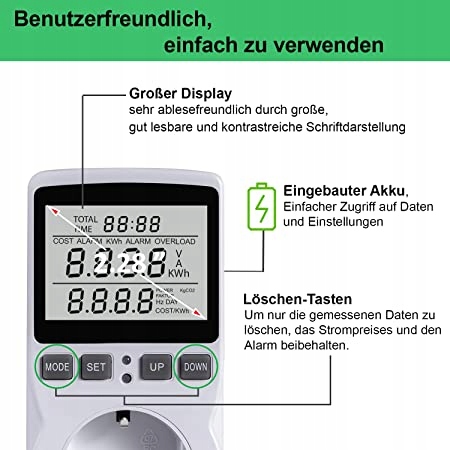 - Этот цифровой счетчик энергии Novkit измеряет потребление энергии и рассчитывает общую стоимость энергии на основе цены на электроэнергию, установленную вами