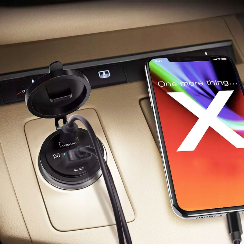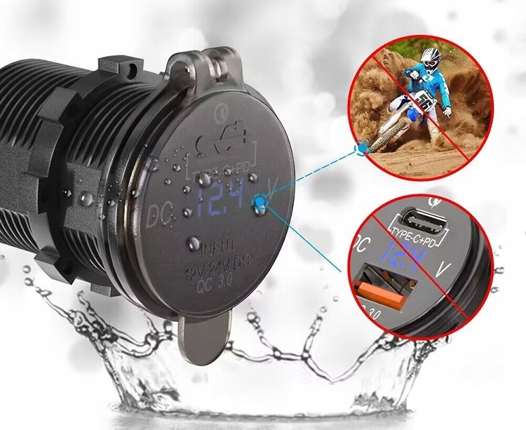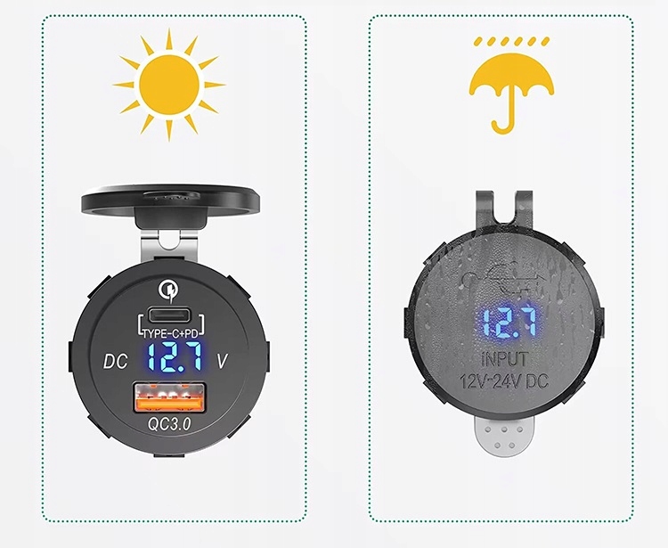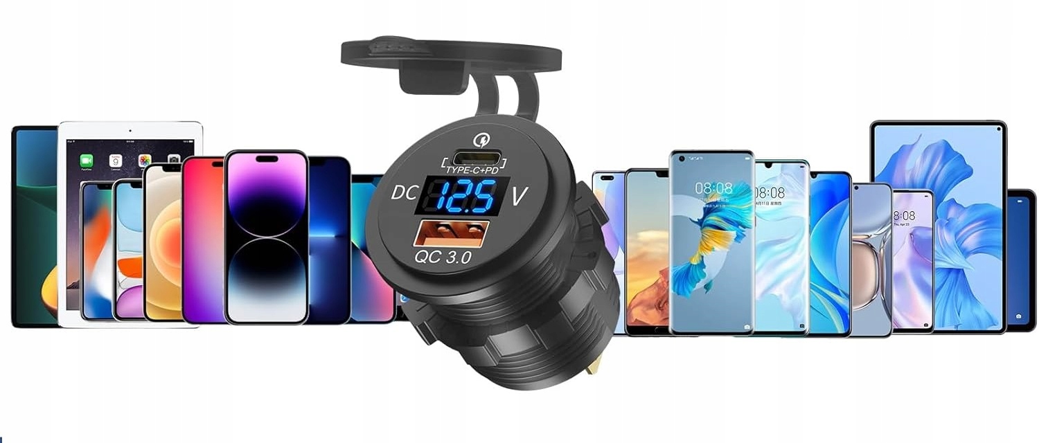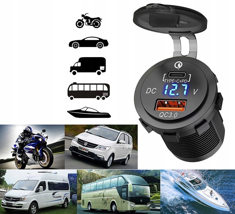 Зарядное устройство с цифровым вольтметром отображает ток уровня напряжения батареи и с двумя портами USB: быстро зарядка QC3.0 и PD USB c. Набор позволяет использовать оба розетки одновременно , то есть зарядку, например, Навигация и телефон одновременно. монтаж на плоских поверхностях , таких как панель панели, автомобильная обивка или в случае двух шлюх, например, в жилье.