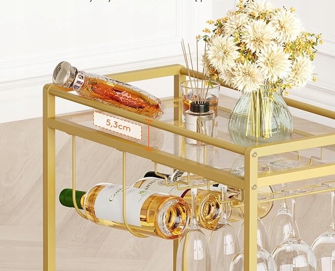 - Легкий и роскошный стиль: эта тележка на колесиках с золотым металлическим каркасом и прозрачным закаленным стеклом излучает роскошь. Его изысканный дизайн органично дополнит интерьер вашего дома, а изящная структура создает элегантную атмосферу, которая поднимает ваше пространство на новый уровень.