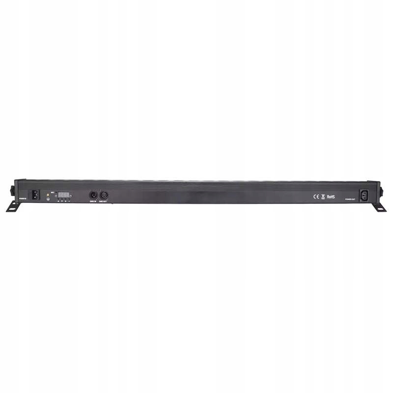 Светодиодная лента Light4Me Deco Bar оснащена 24 мощными 3-ваттными диодами (3 на 8 секций), работающими со светом в цветовой палитре RGB. На задней панели расположены разъемы питания (в том числе так называемая «pass it on», позволяющая передавать напряжение напрямую от устройства к устройству), DMX-вход и выход, а также панель управления с цифровым дисплеем и четырьмя кнопками. С их помощью мы можем изменить настройки в меню и выбрать один из четырех интересующих нас режимов работы: