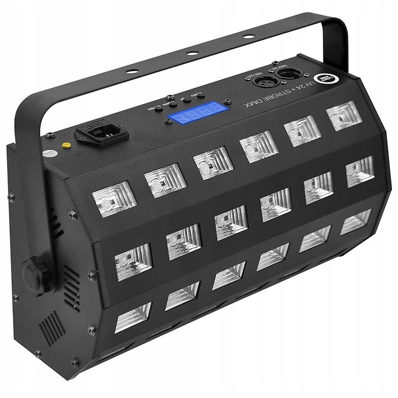 Light4me UV 24 + Strobe DMX - это прожектор профессиональной сцены, который сочетает в себе сильные ультрафиолетовые светодиоды и стробоп. Это отличный выбор для клубов, дискотеков и других инсталляций освещения
