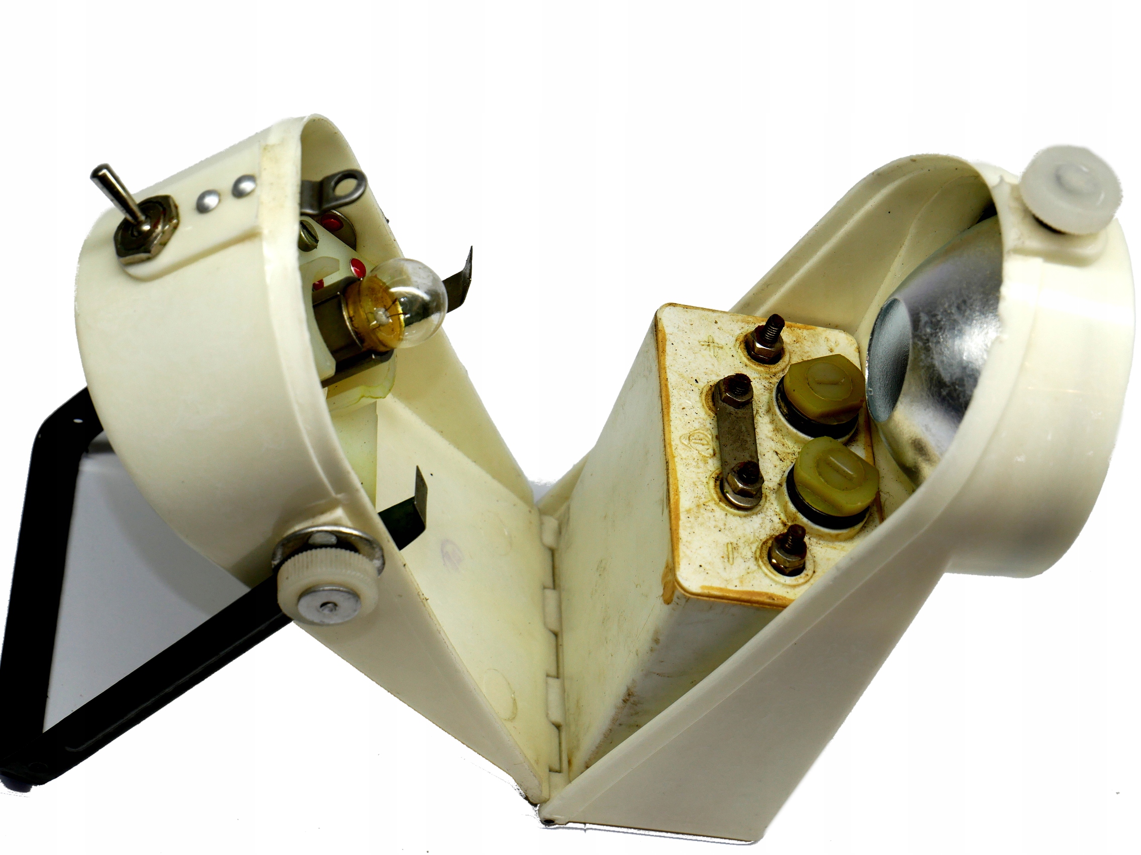 Старый аккумуляторный фонарик цвета слоновой кости с черной основой и серым подвесным держателем. Товар поступает с военных складов.