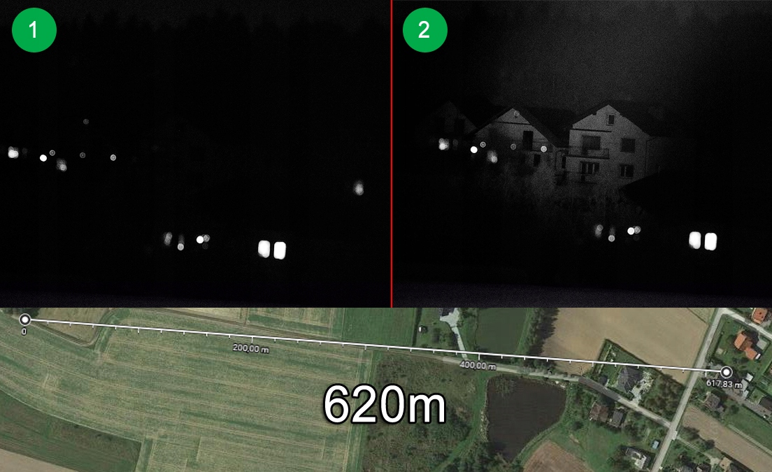 Наш диод потребляет малый ток, сохраняя при этом соответствующую эффективность. Входное напряжение составляет 1,75 В, ток около 0,75 А. Мощность, потребляемая лазером, составляет около 1,3 Вт (мощность, потребляемая от аккумулятора, около 1,7 Вт — из-за более высокого напряжения, подаваемого на фонарик 4,2 В, возникают потери мощности системы понижения напряжения). Управляемый таким образом диод позволяет продлить время работы осветителя на одном заряде аккумулятора. Ниже представлены фотографии с теста, выполненного на расстоянии 620м. Заявленная дальность около 900м реальна.