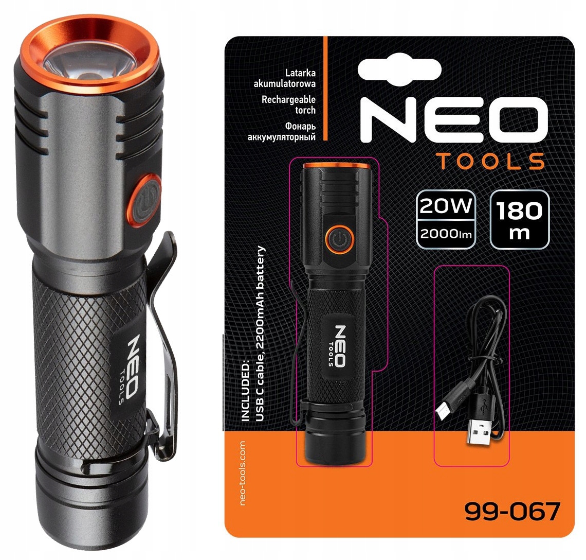 Нео батарейный фонарик (ссылка 99-067) оснащен светодиодом со светящимся потоком Lumens 2000 и мощностью 20 Вт