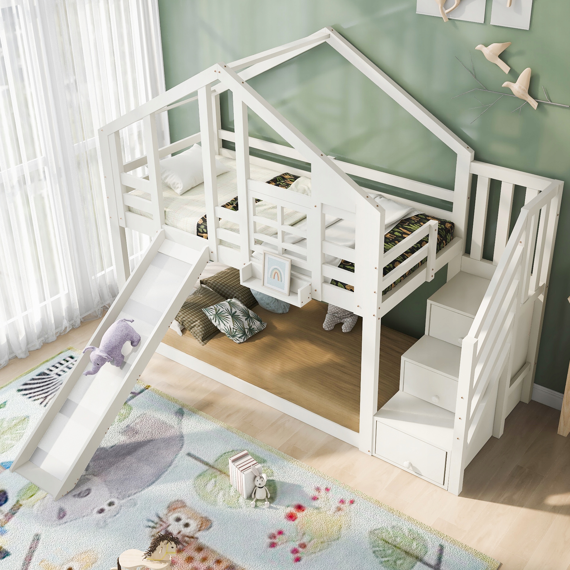 Кровать домик двухъярусная 90х200 с горкой, бортом и перилами, белая