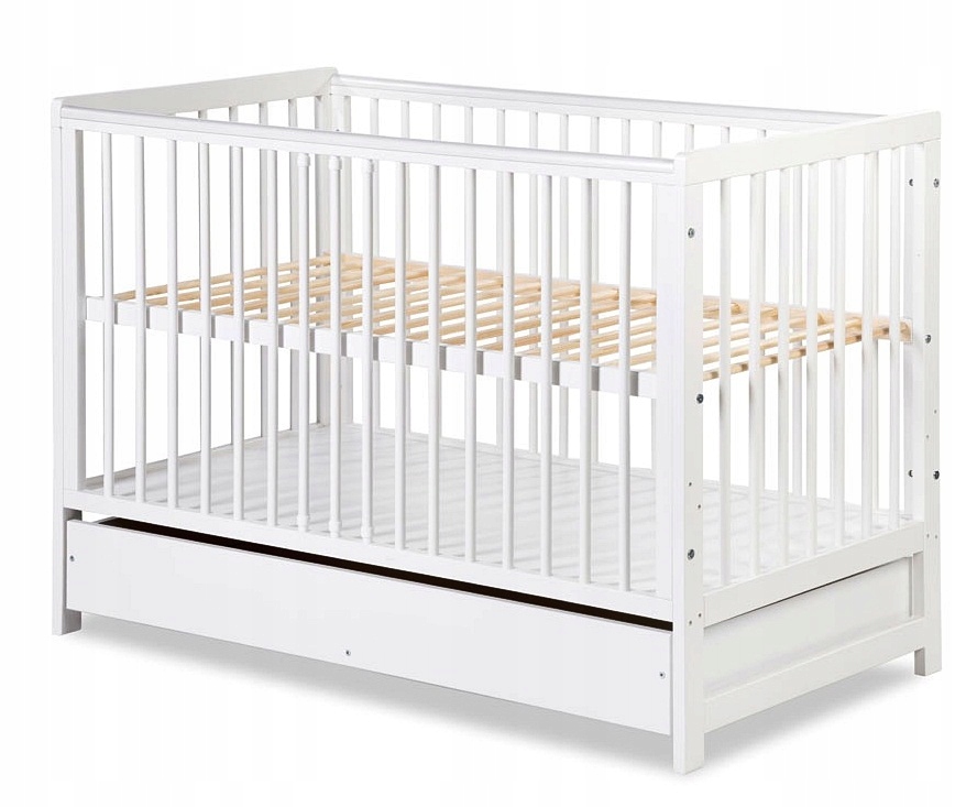 Деревянная кровать TIMI – продукт польского производителя Klupś, изготовленный из древесины сосны и крашеного МДФ. Кровать белого цвета, имеет внутренние размеры 120 х 60 см и внешние размеры 124 х 65 х 86 см. Высоту дна кровати можно регулировать на трех разных уровнях, а перекладины съемные, что облегчает доступ к ребенку. Кровать также имеет защитные чехлы на верхней планке, чтобы ребенок, прорезывающий зубы, не повредил кровать.