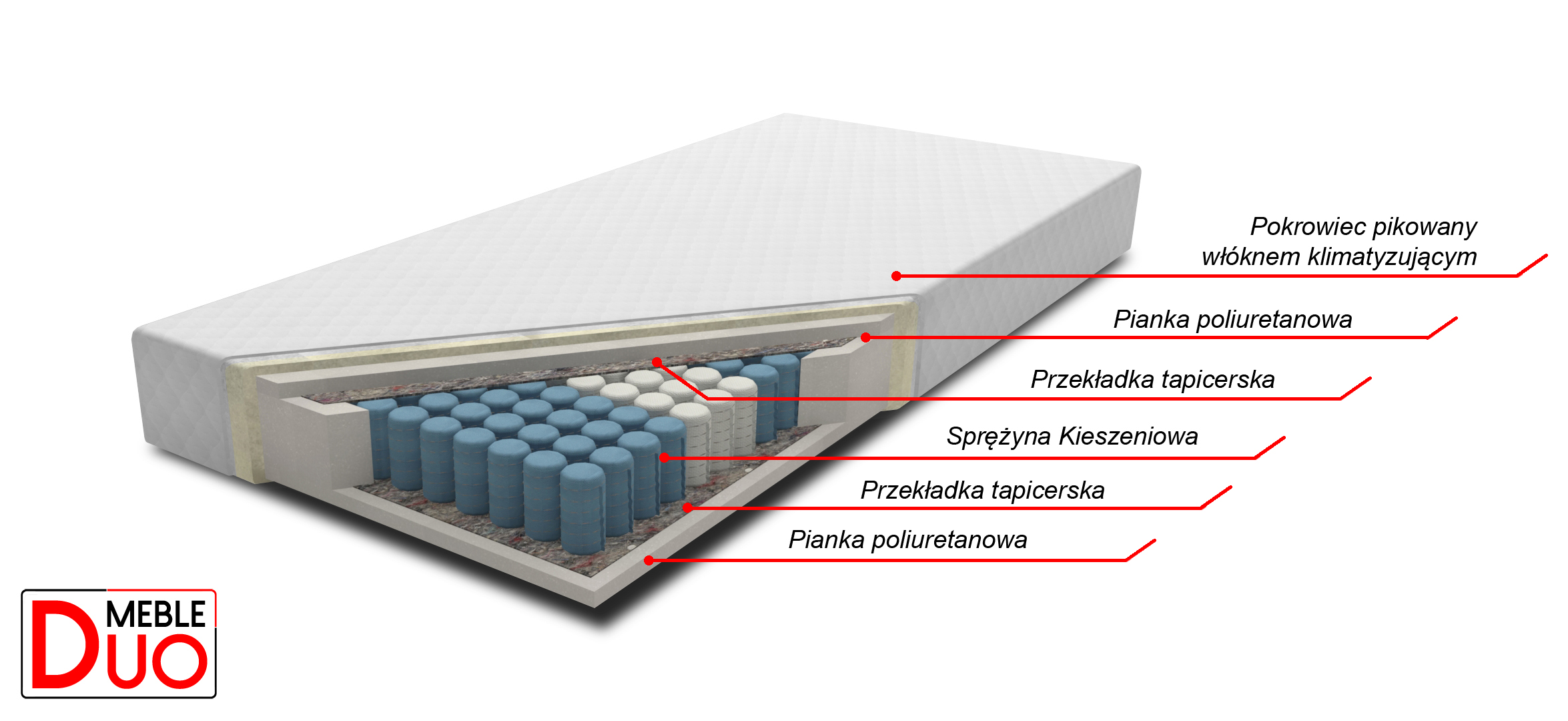 The Тип используемой пружины характеризуется тем, что каждая пружина заключена в отдельный материальный карман и дополнительно растянута примерно на 30% для исключения риска разрушения. Благодаря отсутствию связи между пружинами каждая из них может работать независимо от остальных, что исключает эффект провисания большой поверхности матраса под действием давления на небольшую поверхность, характерный для матрасов, изготовленных на основа классической пружины Bonnell. В случае матраса с карманной пружиной, на котором спят два человека, сверление и поворот одного из них не будет ощущаться другим. Разница в весе двух человек, спящих вместе на одном матрасе, также не будет иметь значения, что в случае с матрасом со стандартной пружиной приводит к сползанию более легкого человека на более тяжелого из-за образования «ямы» вокруг матраса. более тяжелый человек.