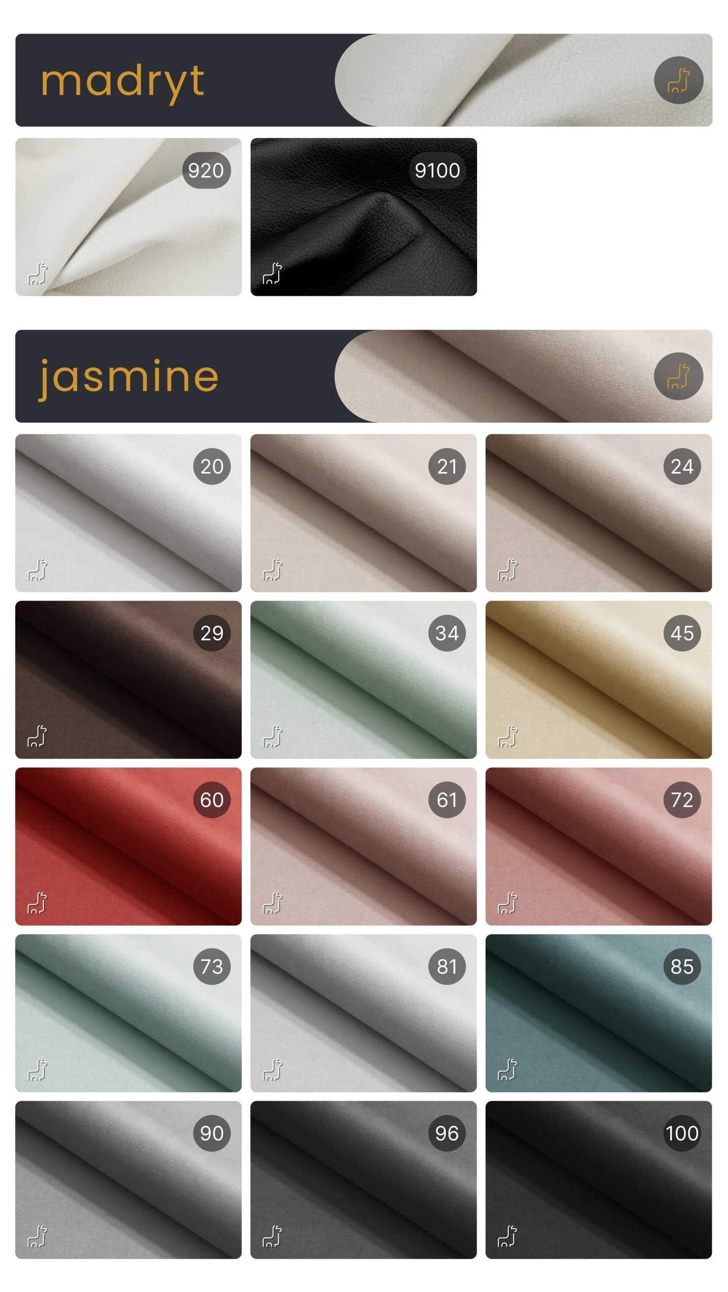 Ткань ЖАСМИН устойчива к истиранию, очень прочна, очень мягка и доступна в натуральных цветах. Она плюшевая, поэтому ткань «расчесывается с волосами» и приятна на ощупь.