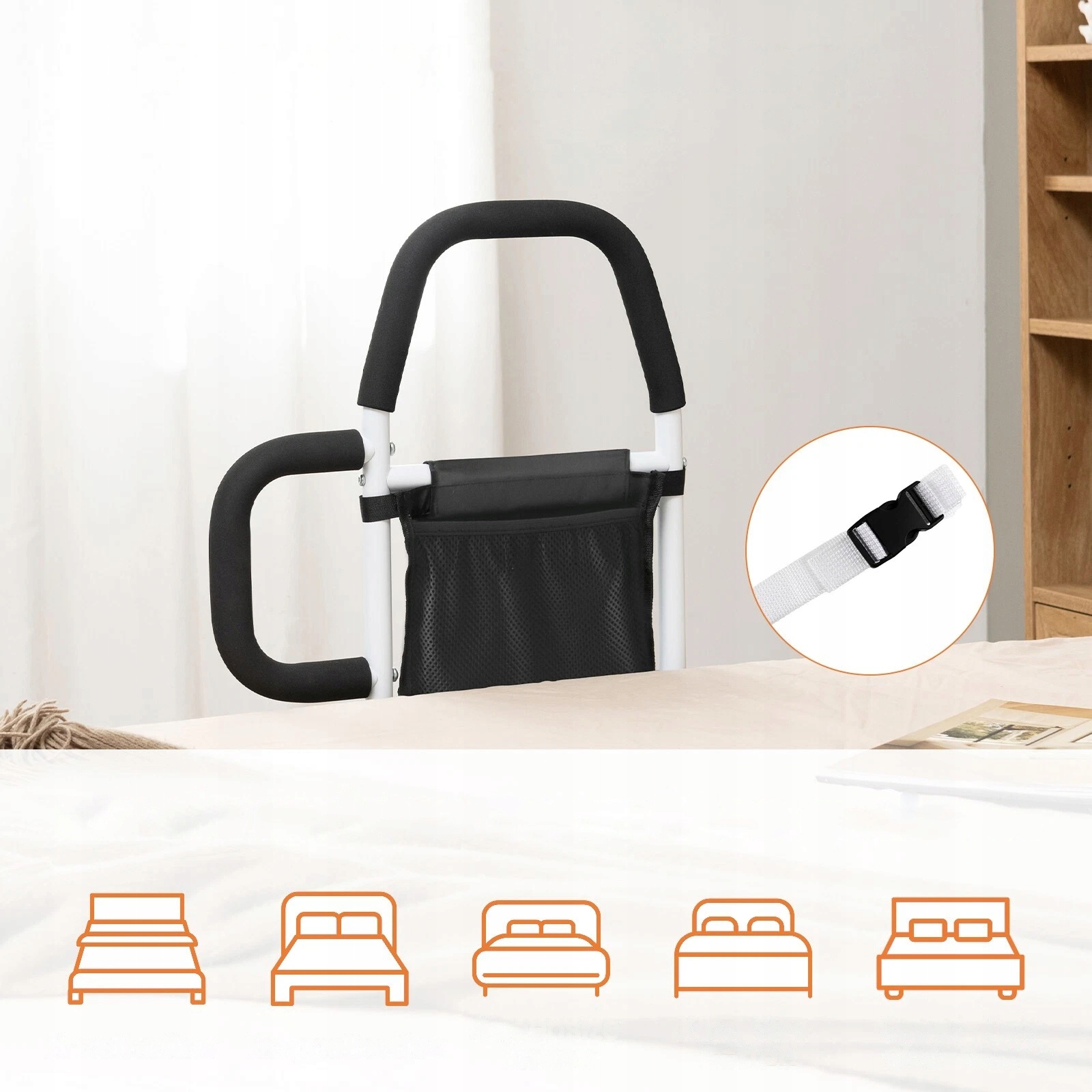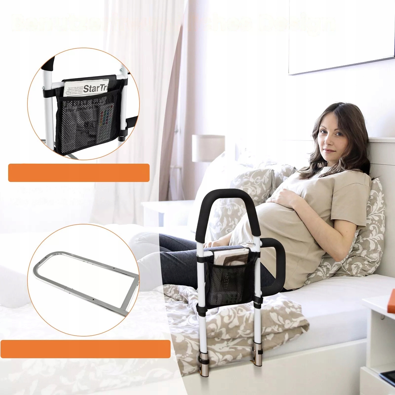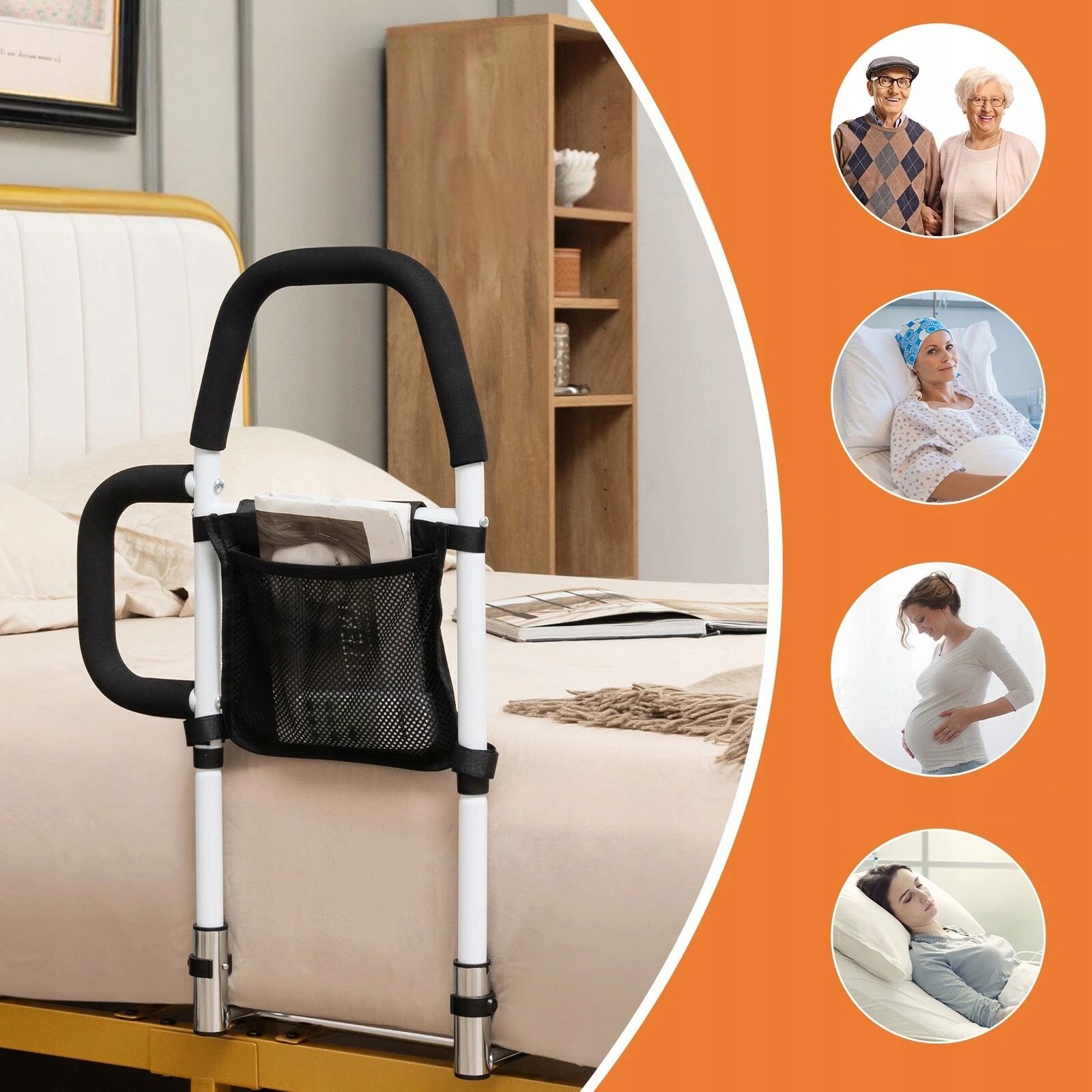 🛡【Удобный дизайн】 Съемный карман позволяет держать под рукой все необходимое, например, очки, мониторы и материалы для чтения. Боковую ручку можно прикрепить к обеим сторонам поручня кровати, что делает поручень кровати пригодным для использования с обеих сторон кровати.