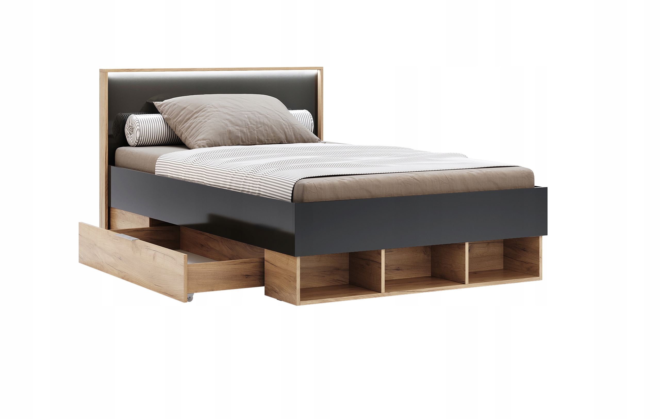 Изголовье кровати со светодиодной подсветкой можно использовать как прикроватную тумбочку. Кровать оборудована функциональными нишами — тремя отдельными открытыми местами для хранения вещей. Прекрасное место для хранения необходимых вещей или альков можно дополнить украшениями. Кровать шириной 1,2 м и 1,4 м имеет два выдвижных ящика, в которых одновременно можно разместить подушку, постельное белье и одеяло.