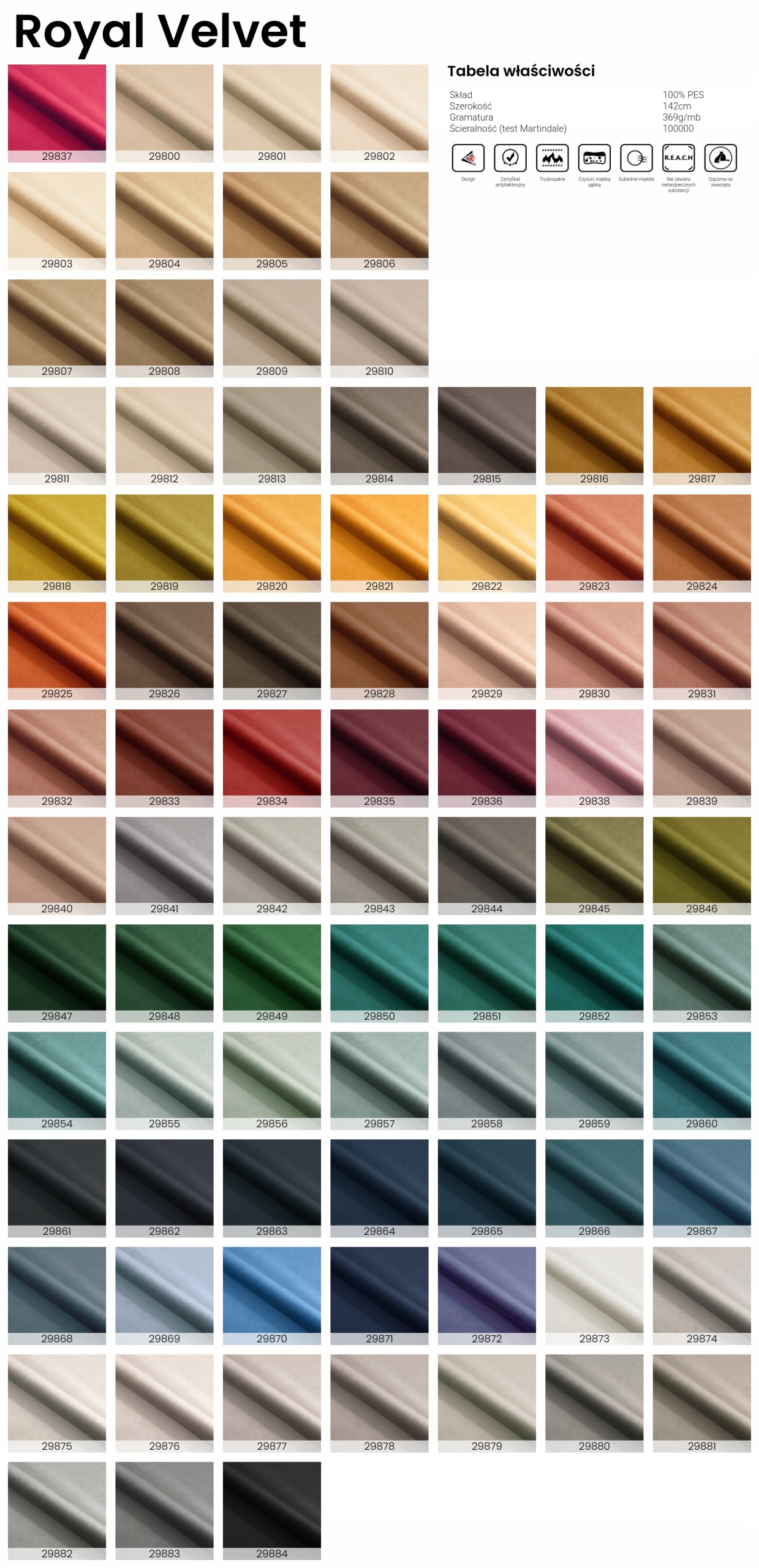 Royal Velvet — велюровая ткань с плюшевой текстурой, плотная, пушистая и исключительно мягкая на ощупь. Идеально подходит для интерьеров, которым нужна элегантность и уют. Его насыщенные цвета и матовая поверхность придают помещению благородный характер. Обогащенная специальной стабилизирующей подложкой ткань не только красиво выглядит, но также прочна и устойчива к растяжению. ️