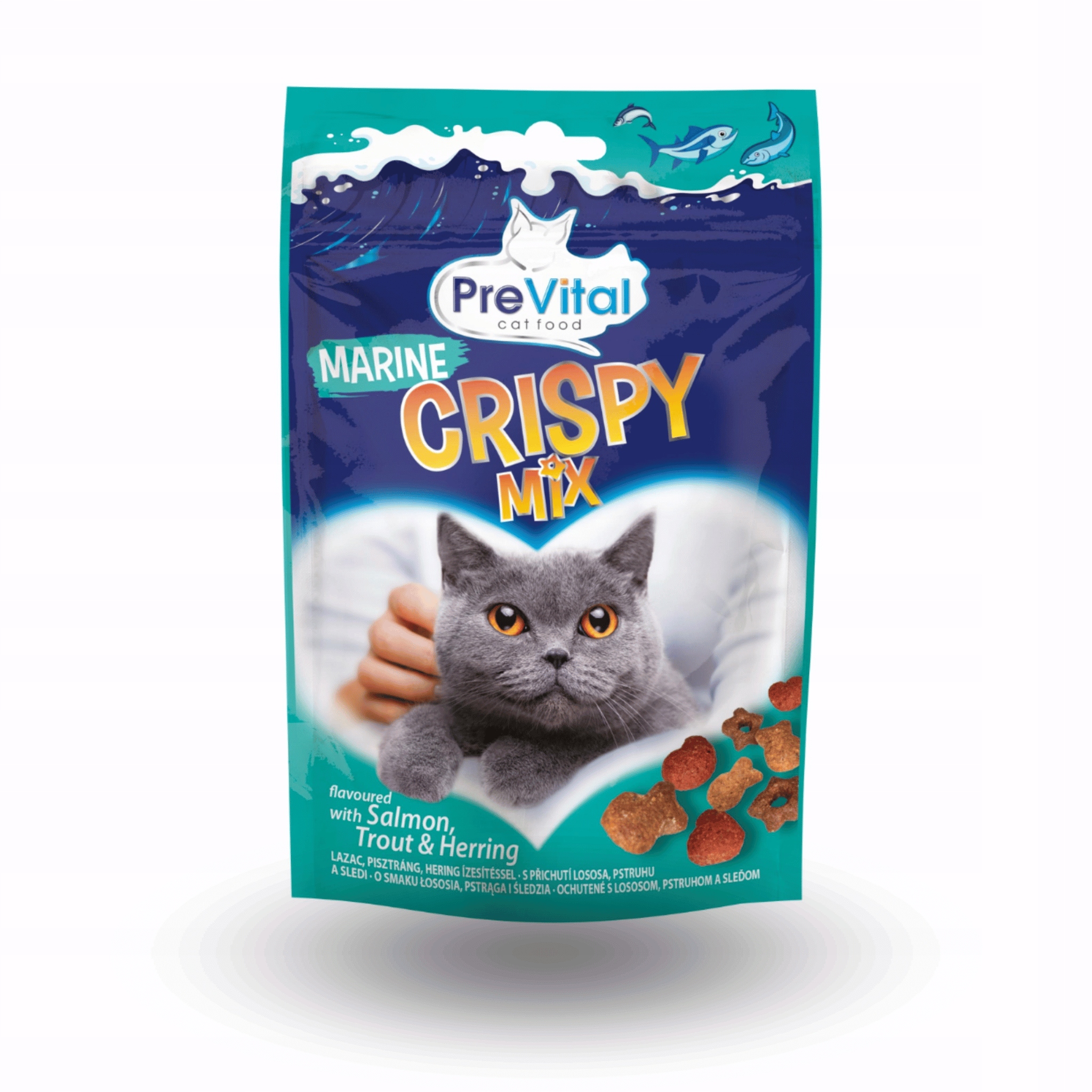 PreVital Crispy Mix — это дополнительный корм для взрослых кошек. Хрустящие гранулы со вкусом лосося, форели и сельди обогащены минералами и витаминами, чтобы обеспечить наилучшее состояние вашей кошки. Продукт отлично подойдет в качестве награды для непослушных кошек.