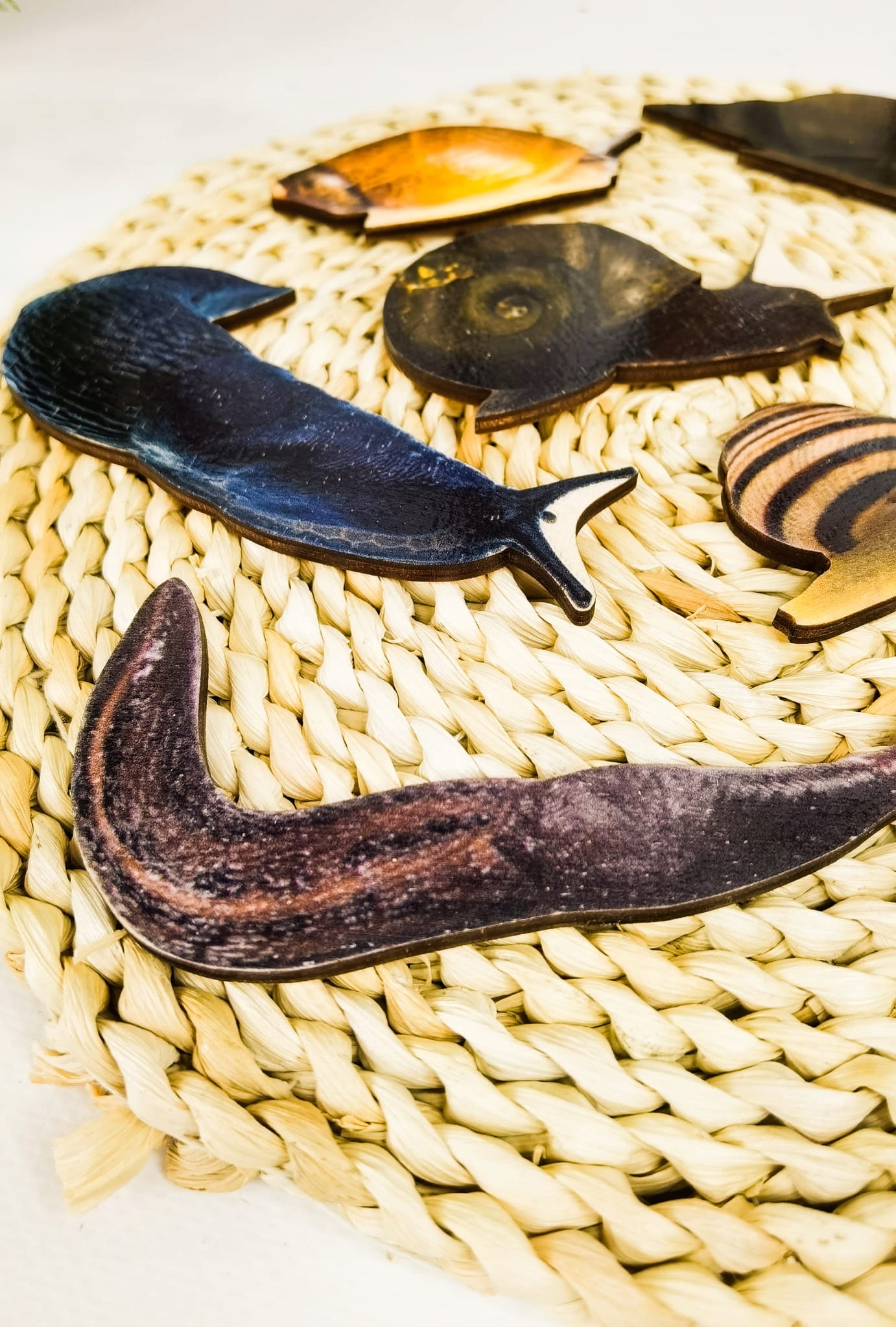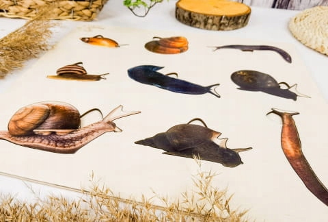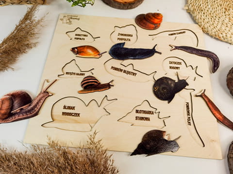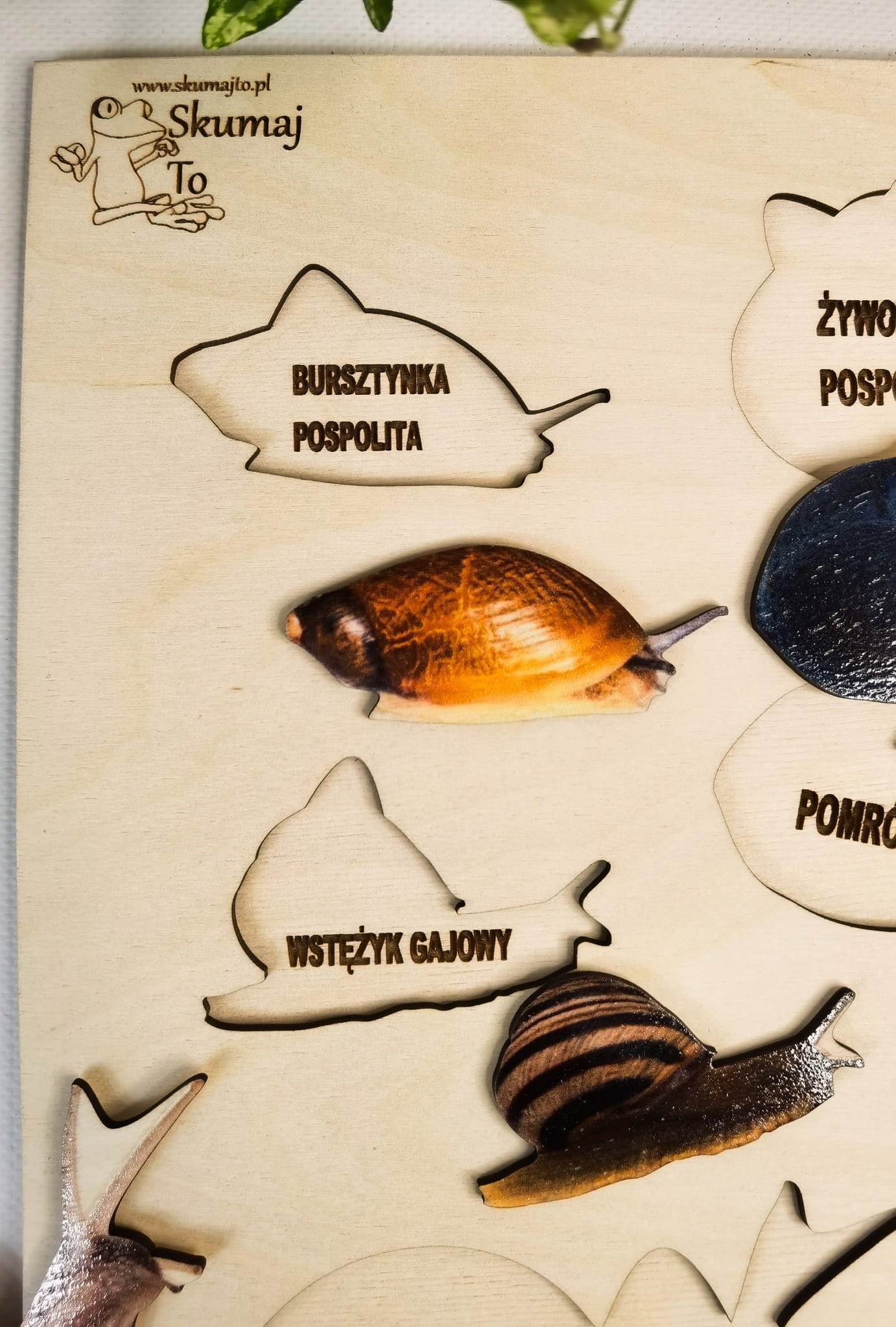 Ślimaki, drewniana układanka, gatunki ślimaków