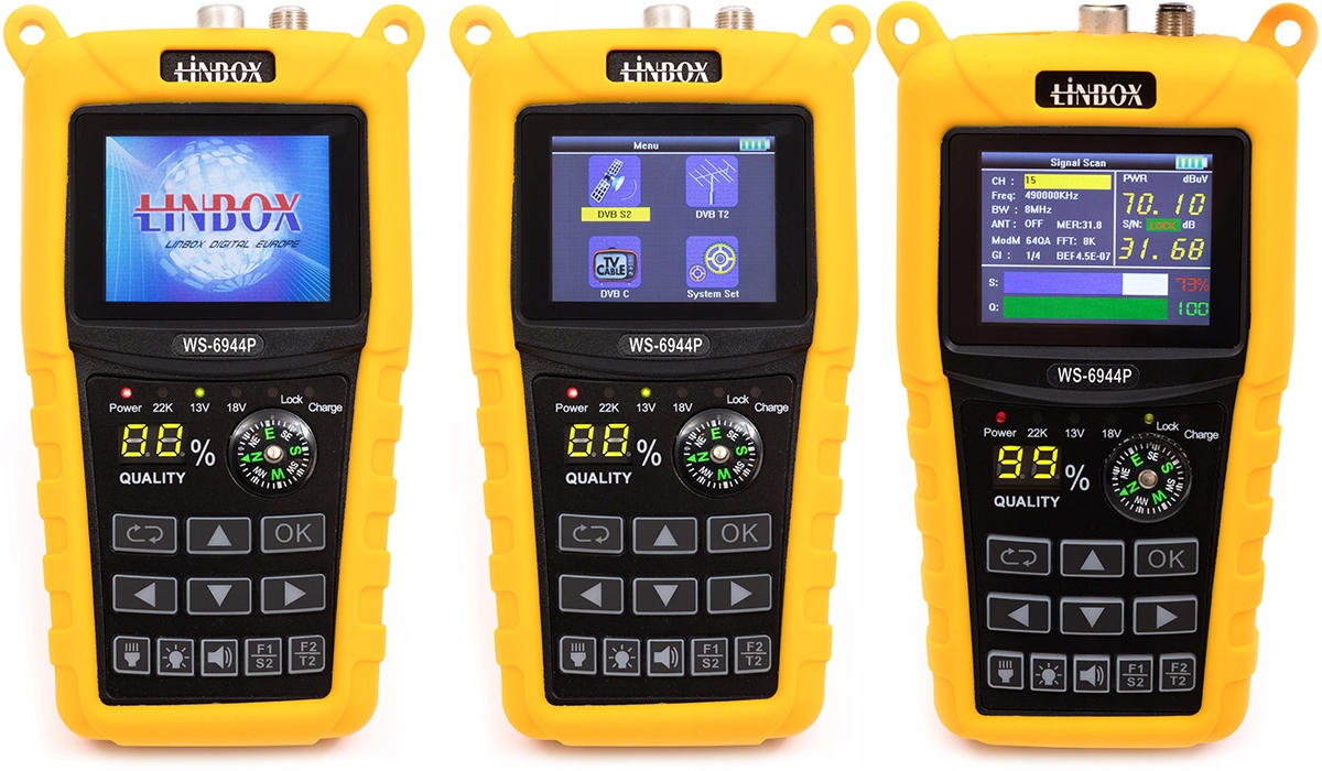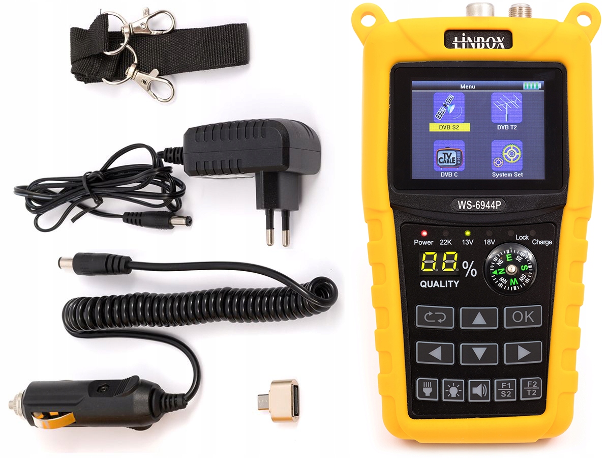 Измеритель спутникового, наземного и кабельного сигнала компании Linbox, модель WS-6944 с цветным ЖК-дисплеем. Благодаря очень чувствительной спутниковой головке она позволяет легко и точно настроить спутниковую антенну на нужный спутник. Измеритель подготовлен для поиска уровня сигнала на всех спутниках Европы (HOTBIRD, ASTRA И ДРУГИЕ) и имеет введенные позиции нескольких спутников (спутники + транспондеры). Встроенный редактор позволяет редактировать любые параметры спутника и транспондеров. Модель WS-6944 имеет измерение каналов DVB-S2 – HD. В комплект входят фирменный блок питания и автомобильное зарядное устройство, меню счетчика на польском языке, что облегчает его использование. Заземляющий датчик измеряет уровень, качество сигнала и MER