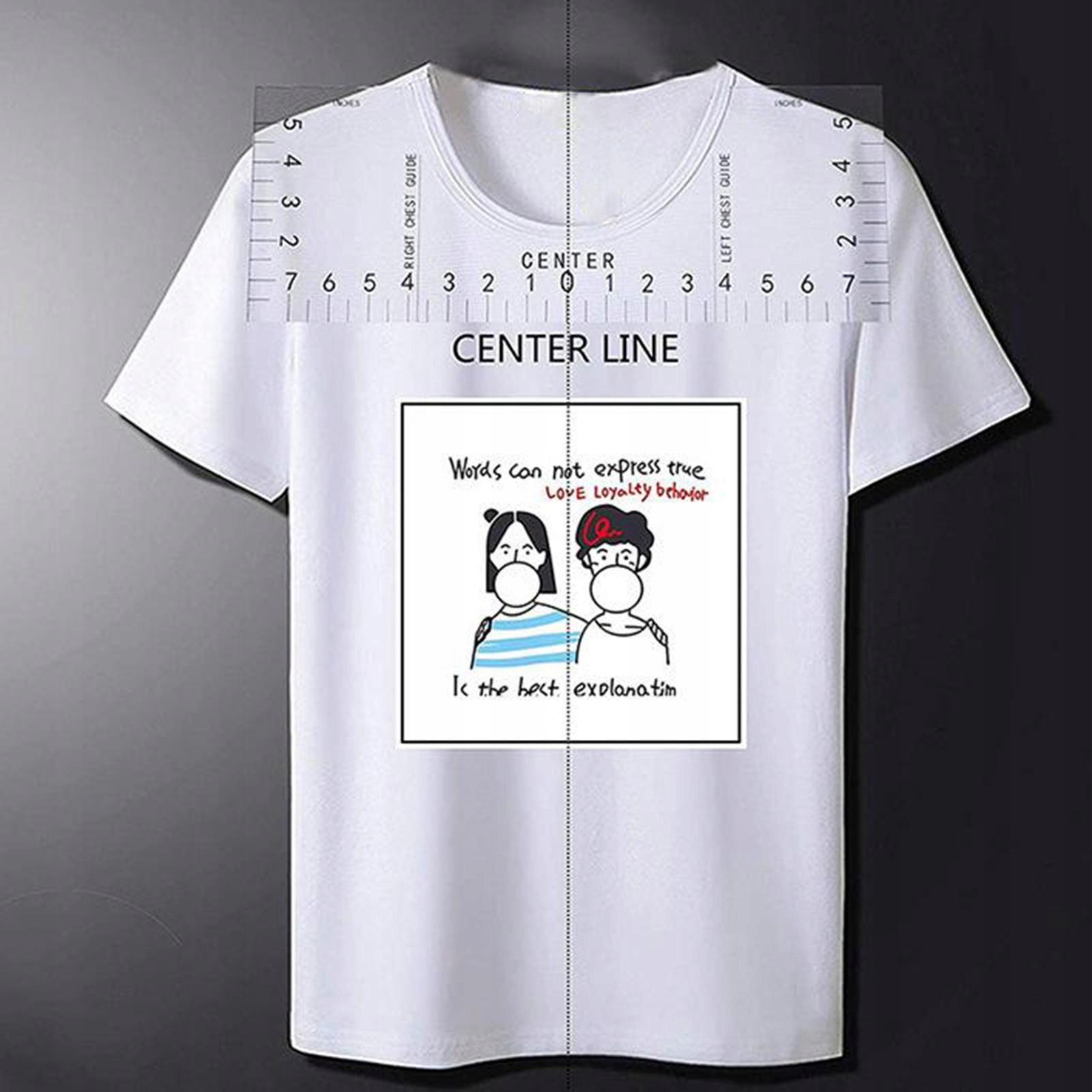 Простота в использовании: просто приложите линейку к воротнику, отцентрируйте рисунок и совместите его с футболкой