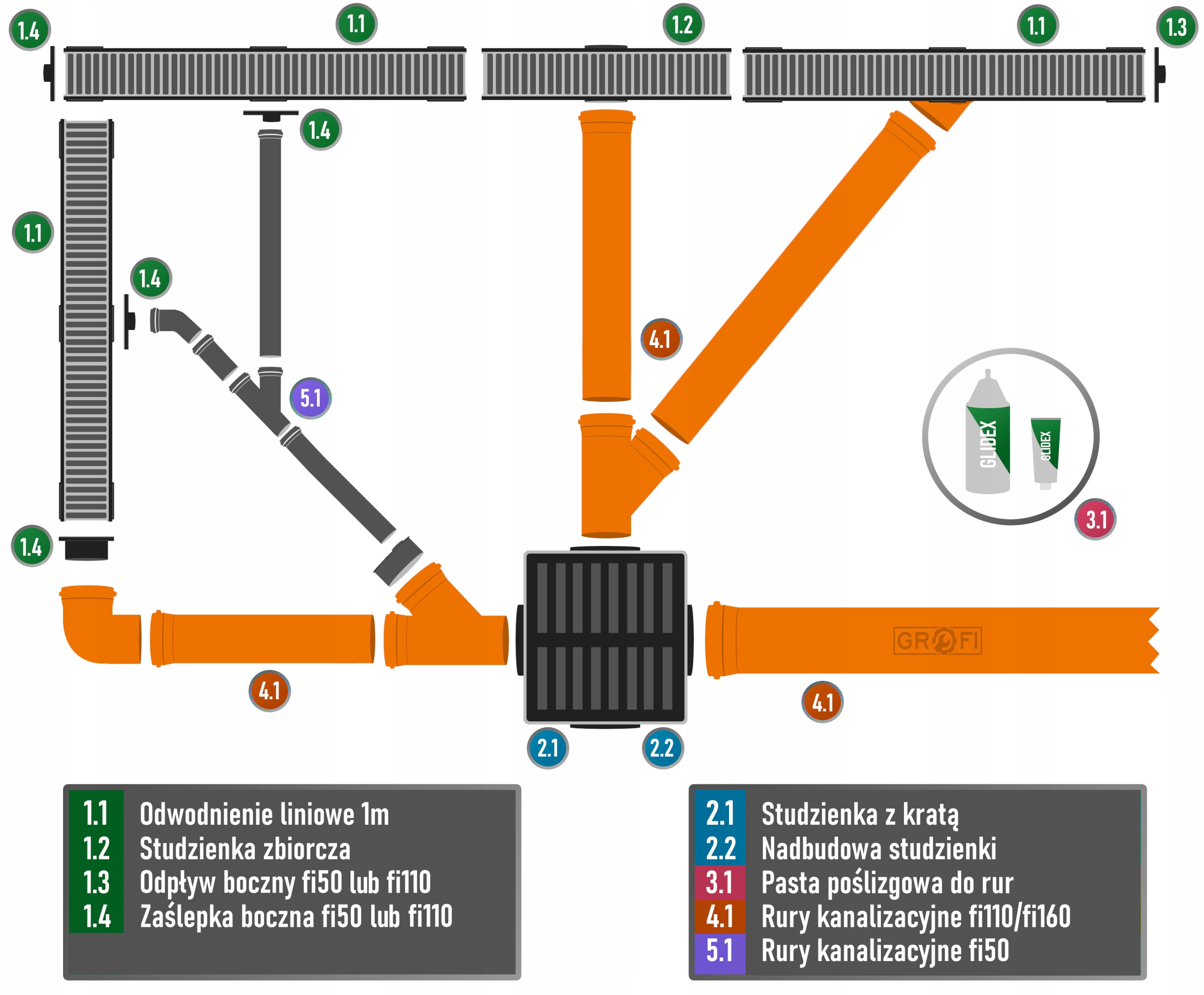 Система позволяет подключить канализационные трубы F50 и Fi110.