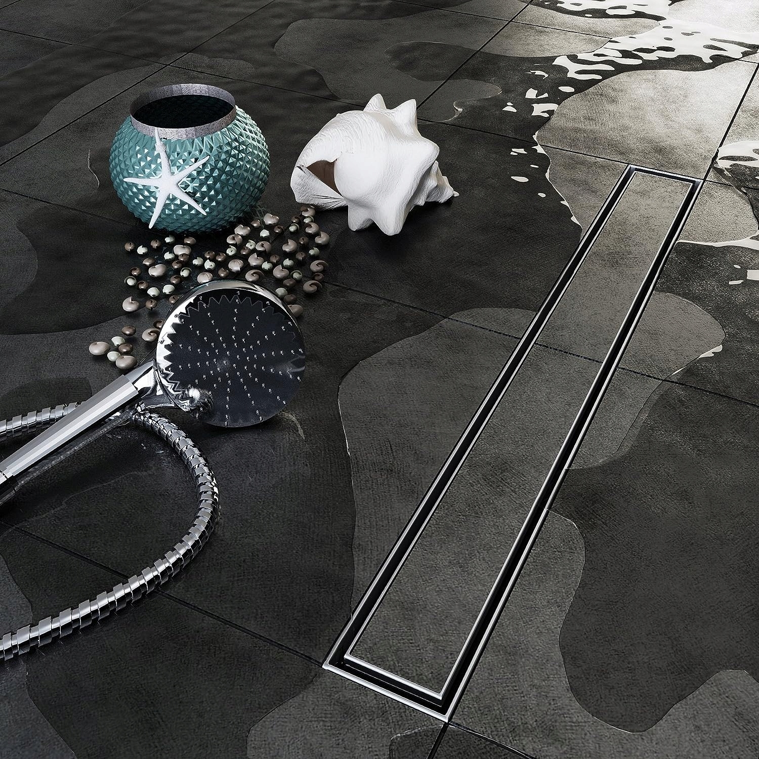 линейный слив стальной, крышка с выбранным рисунком толщиной 1,5 мм, сифон с корзиной и выпускным отверстием,