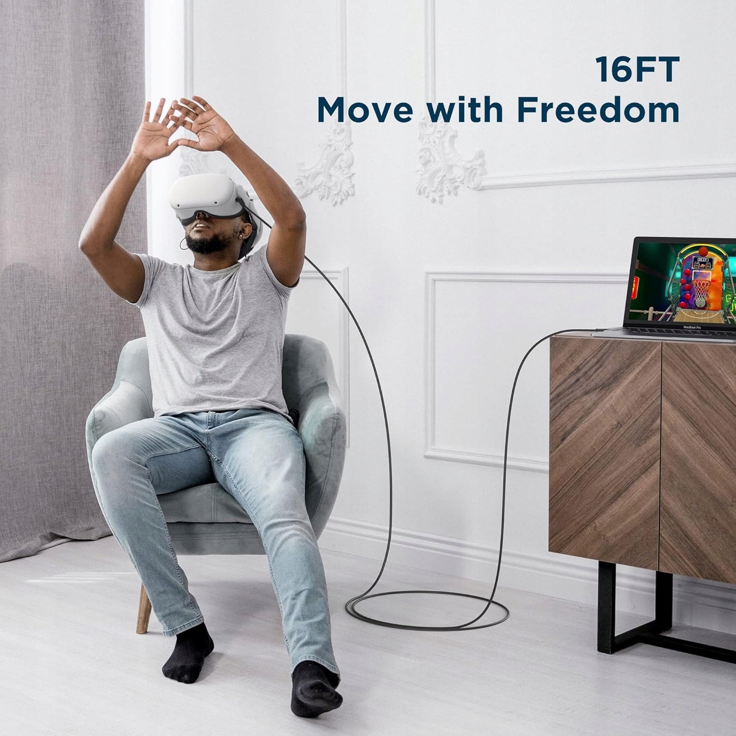Длинный и гибкий: Этот кабель длиной 5 м позволяет вам свободно и без ограничений передвигаться во время игр, просмотра фильмов или прослушивания музыки, еще больше погружая вас в виртуальный мир. Кабель для передачи данных имеет L-образную форму для лучшей защиты интерфейса Quest 3