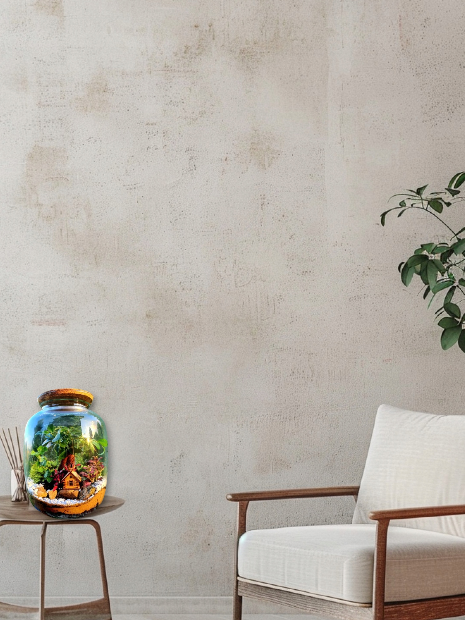 Лес в стекле, представленном в этом предложении, составляет 26 см, шириной 26 см. Лесная композиция в банке была сделана флористом из Фикуса, Фитонии в разных цветах, плющ и отделан мохом и белым, черным гравием и камнями с декоративным домом с правильными правилами, чтобы насладиться правильными правилами. Эта композиция будет работать для солнечного и слегка затененного положения.
