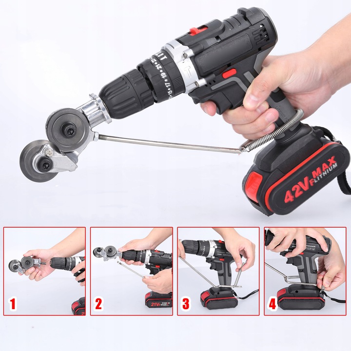 Примечание. В комплект поставки входит только набор (для резки наконечник из листового металла), а не аккумуляторная дрель.