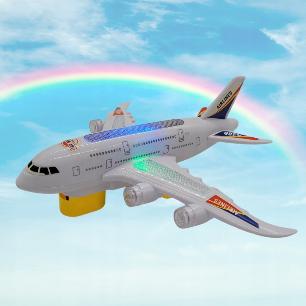 ИГРУШКА САМОЛЕТ, ПИТАНИЕ ОТ 3 БАТАРЕЙОК АА 1,5 В. Самолет издает звук летательного аппарата. Он также имеет зелено-сине-красные световые эффекты, огни на крыльях и фюзеляже. У самолета три колеса, в том числе одно, приводящее его в движение. После столкновения с препятствием игрушка пойдет по новому пути.