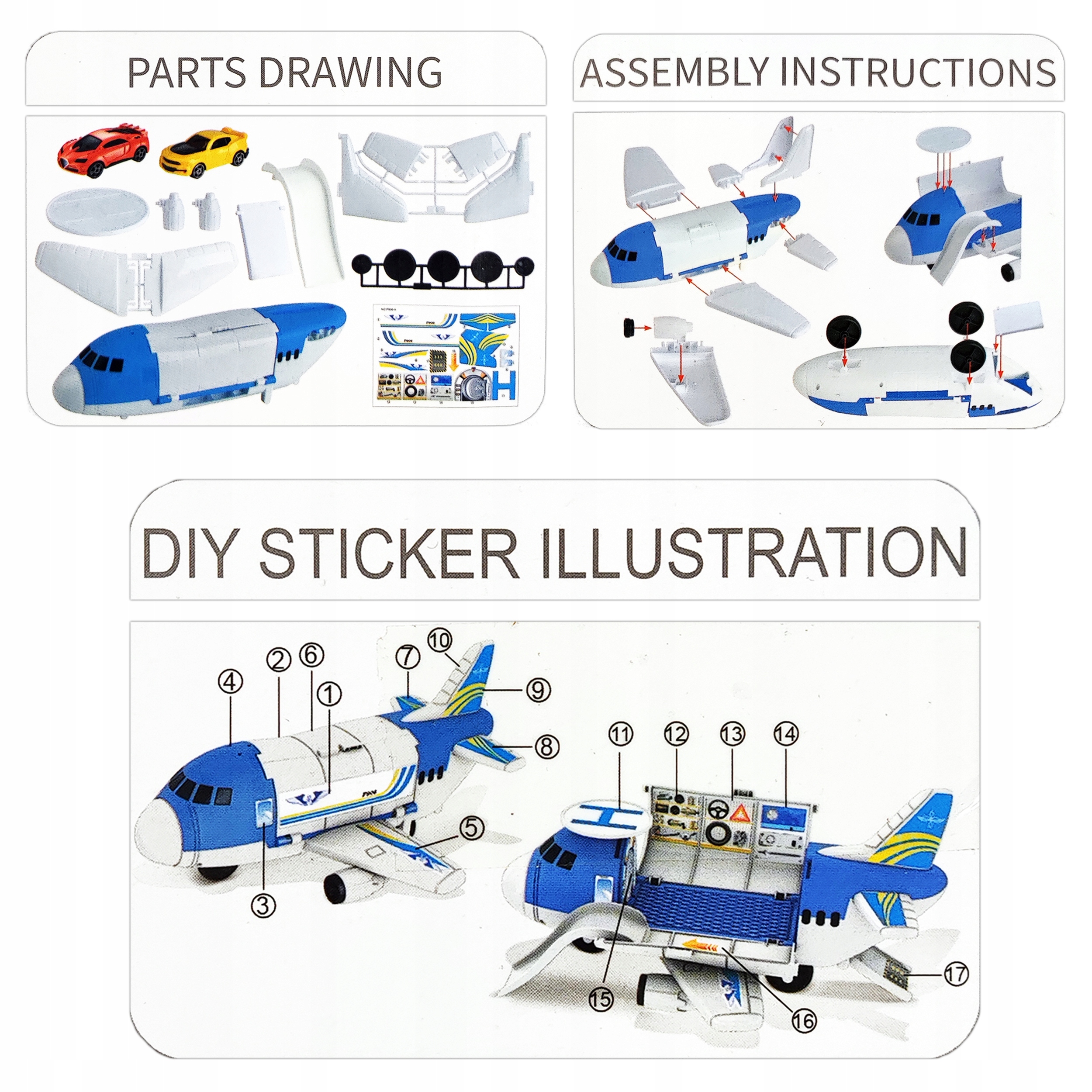 В комплект входят 2 машинки, наклейки и другие предметы, необходимые для сборки самолета, например колеса и крылья.