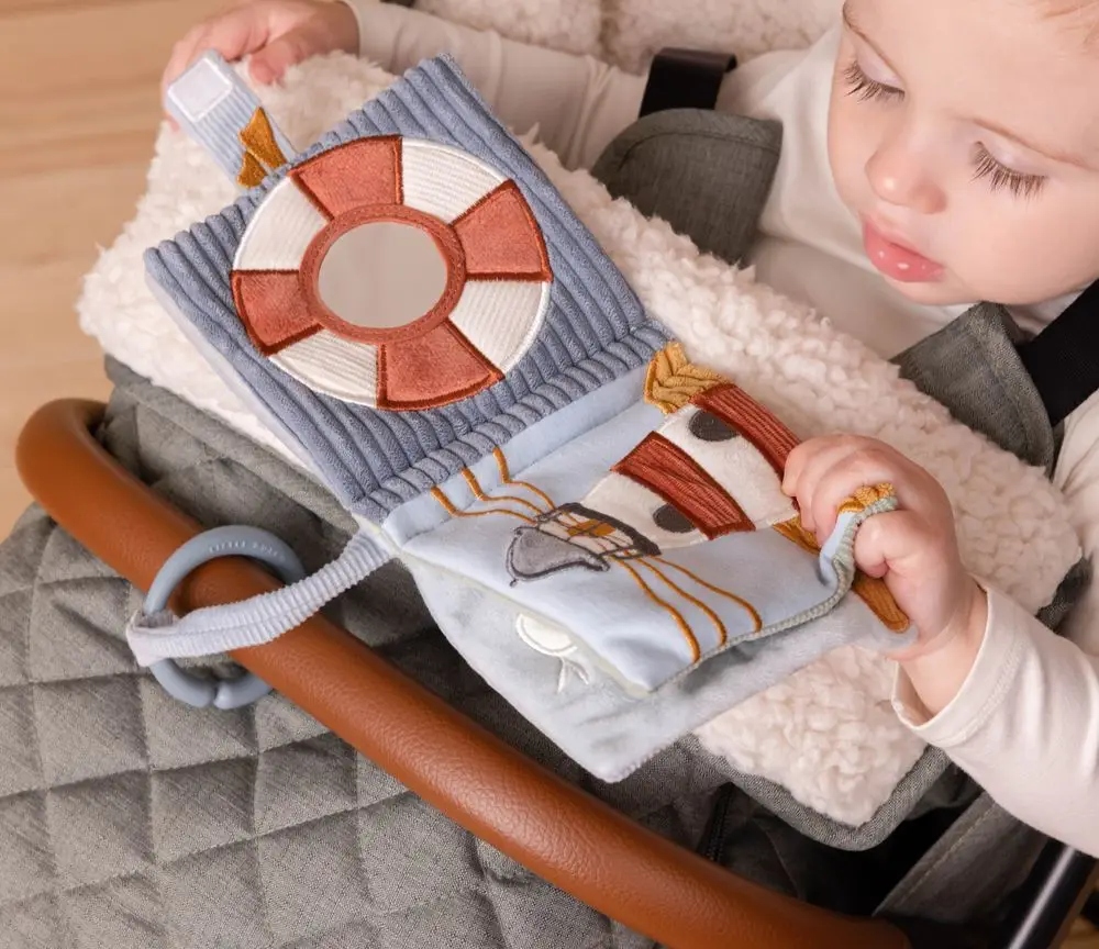 Маленькая голландская сенсорная книга из коллекции Сейлорс Бэй. Он содержит различные текстуры и материалы, благодаря которым малыш может стимулировать свои чувства. В книге есть зеркало, бирки, пищалка и шорох, который очень нравится детям. Книга поддерживает зрительно-моторную координацию. Его можно прикрепить к коляске, гондоле или автокреслу с помощью колеса. Он дополняет другие товары из коллекции Sailors Bay.