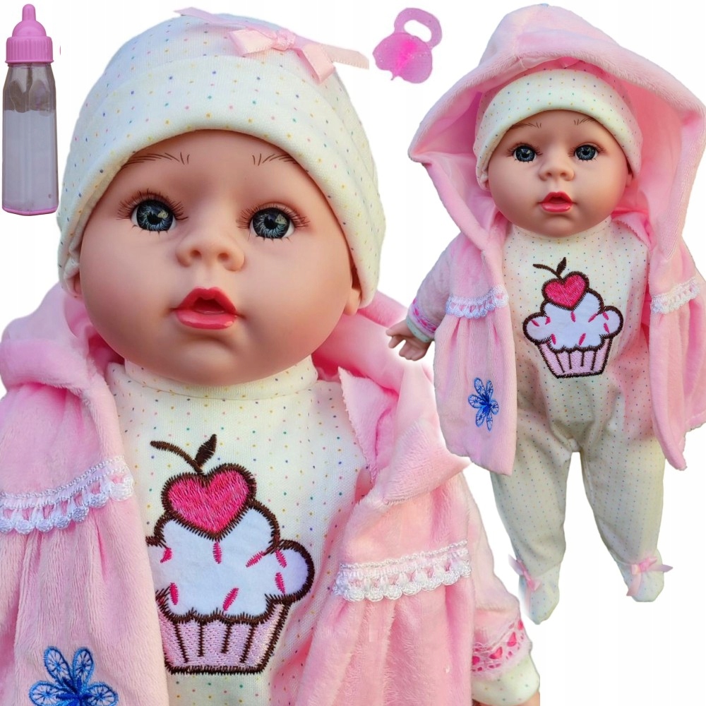 КРАСИВАЯ КУКЛА 40 СМ В КРАСИВОЙ РОЗОВОЙ ОДЕЖДЕ + БЕСПЛАТНАЯ соска И БУТЫЛОЧКА (отправляется случайным образом с молоком или соком)