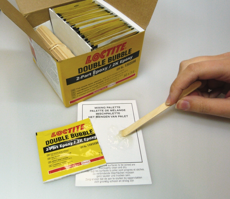 LOCTITE® DOUBLE BUBBLE — эпоксидный клей с адгезией к широкому спектру материалов (например, дерева, металлов, пластмасс и керамики). Он быстро затвердевает и достигает рабочей силы примерно через 5 минут. Этот клей, упакованный в удобные пакетики и поставляемый с лопаточкой для смешивания, готов мгновенно соединить небольшие детали или выполнить быстрый и эффективный ремонт.