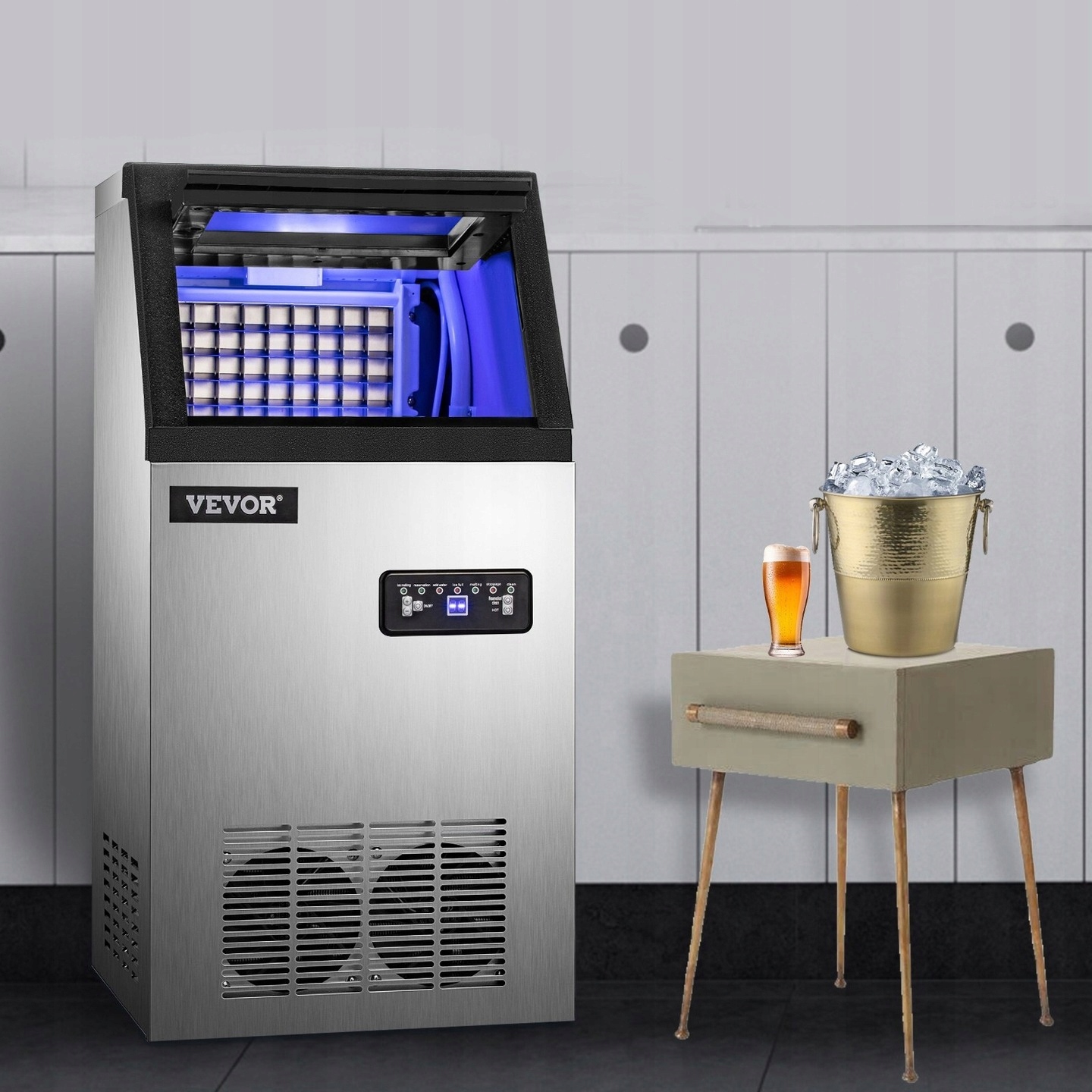 Льдогенератор VEVOR представляет собой стальную машину для производства кубиков льда, оснащенную интеллектуальной панелью управления, бесшумным компрессором и резервуаром для воды. Он производит до 45 кг льда в день, имеет автоматический режим очистки и изоляцию, которая удерживает кубики на месте в течение многих часов.