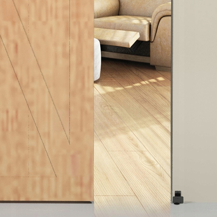 Универсальная нижняя направляющая, благодаря регулируемому основанию, позволяет монтировать двери различной толщины без необходимости их фрезеровки. Направляющая крепится к стене, поэтому нет необходимости сверлить отверстия в полу.